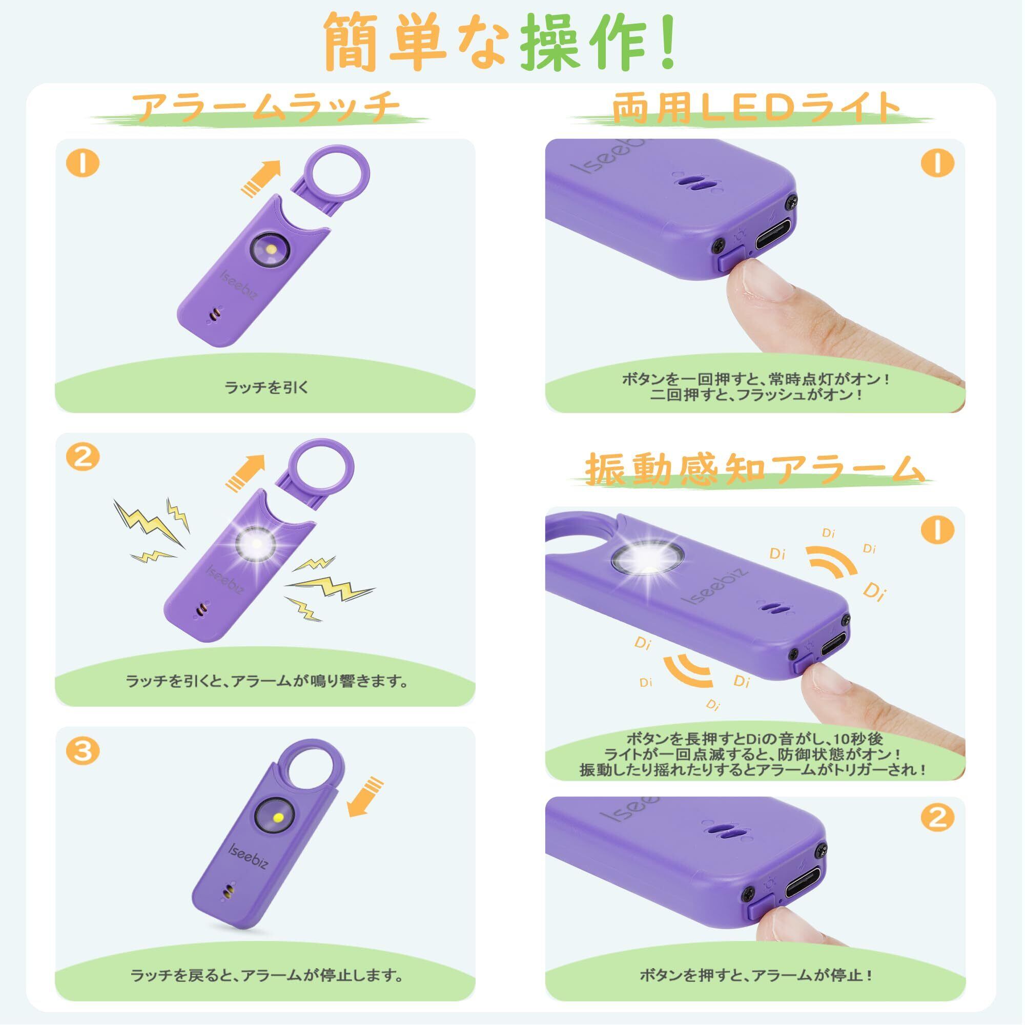 【最新の振動センサー✚両用ライト✚操作簡単】➊アラームラッチモード:ラッチを引いてアラームを鳴らし、ライトが同時に点滅し始めます。音と光のダブルで危険を知らせることができます!➋センサーアラームモード:ボタンを長押すとDiの音がし、10秒後ライトが一回点滅すると、起動します!振動したり揺れたりするとアラームがトリガーされます!夜にドアや窓などにかけることで泥棒の侵入を予防することができます。➌両用ライトモード:この防犯ブザーはライトが付き、夜間歩行の時に懐中電灯として使用できます。危険に遭遇した場合は、フラッシュモードをオンにでき、周囲の人に警告したり注意したりすることができます。