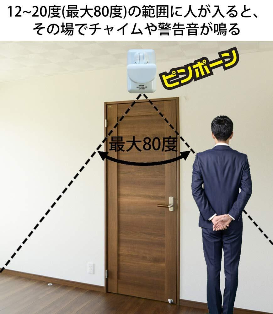 12~20度(最大80度)の範囲に人が入ると、その場でチャイムや警告音が鳴る。感知範囲が狭いからピンポイントで確実に感知