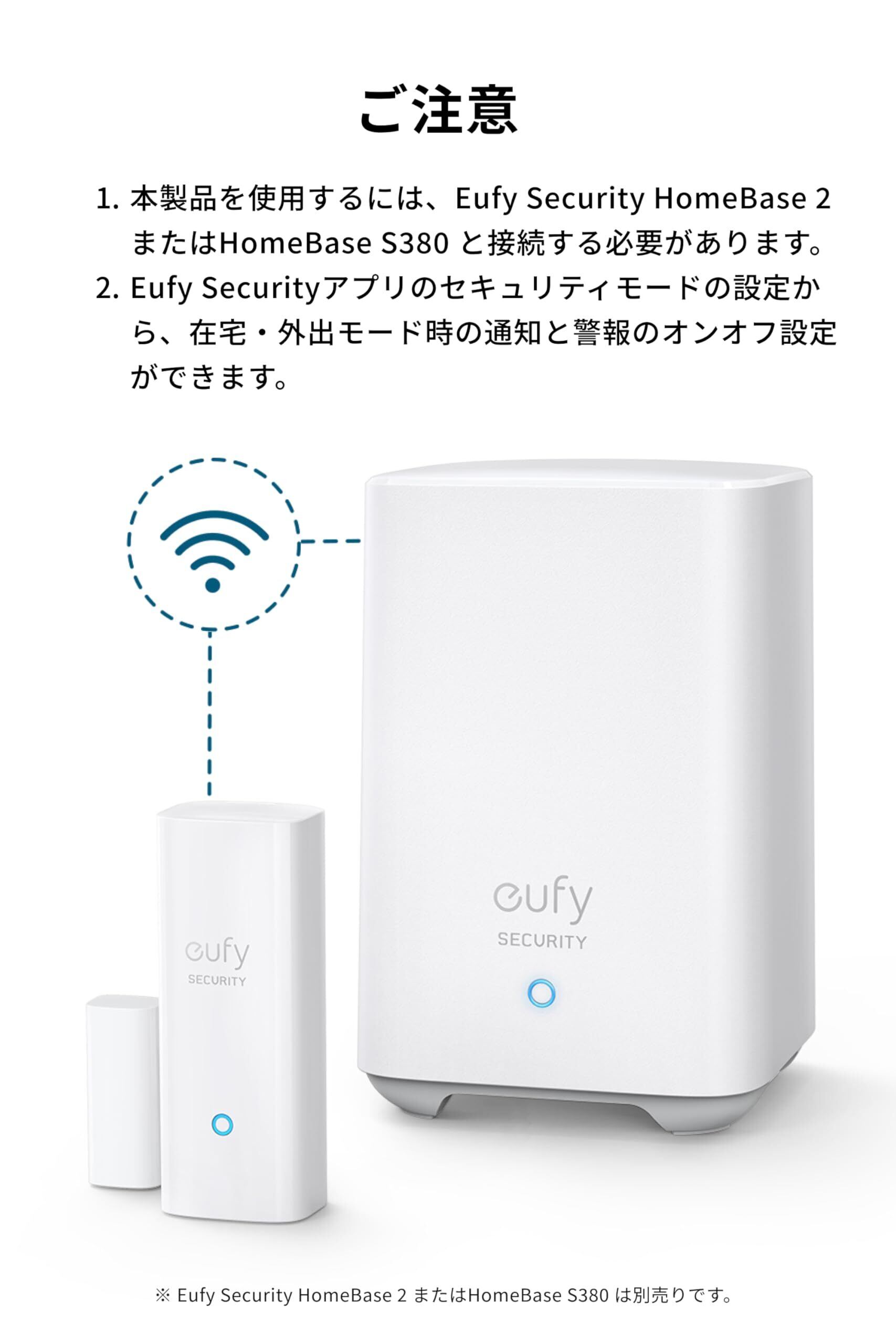 ドア・窓からの侵入検知:ドアまたは窓の開閉を検知するとHomeBase (別売り) が最大100dBの警報を鳴らし、Eufy Securityアプリの通知機能でお知らせします。防犯アイテムとしてはもちろん、家族の出入りや来客検知などにも役立ちます。Eufy Securityアプリのセキュリティモードの設定から、在宅・外出モード時の通知と警報のオンオフ設定ができます。 ご注意:本製品を使用するには、別売りのEufy Security HomeBase 2 またはHomeBase S380 と接続する必要があります。