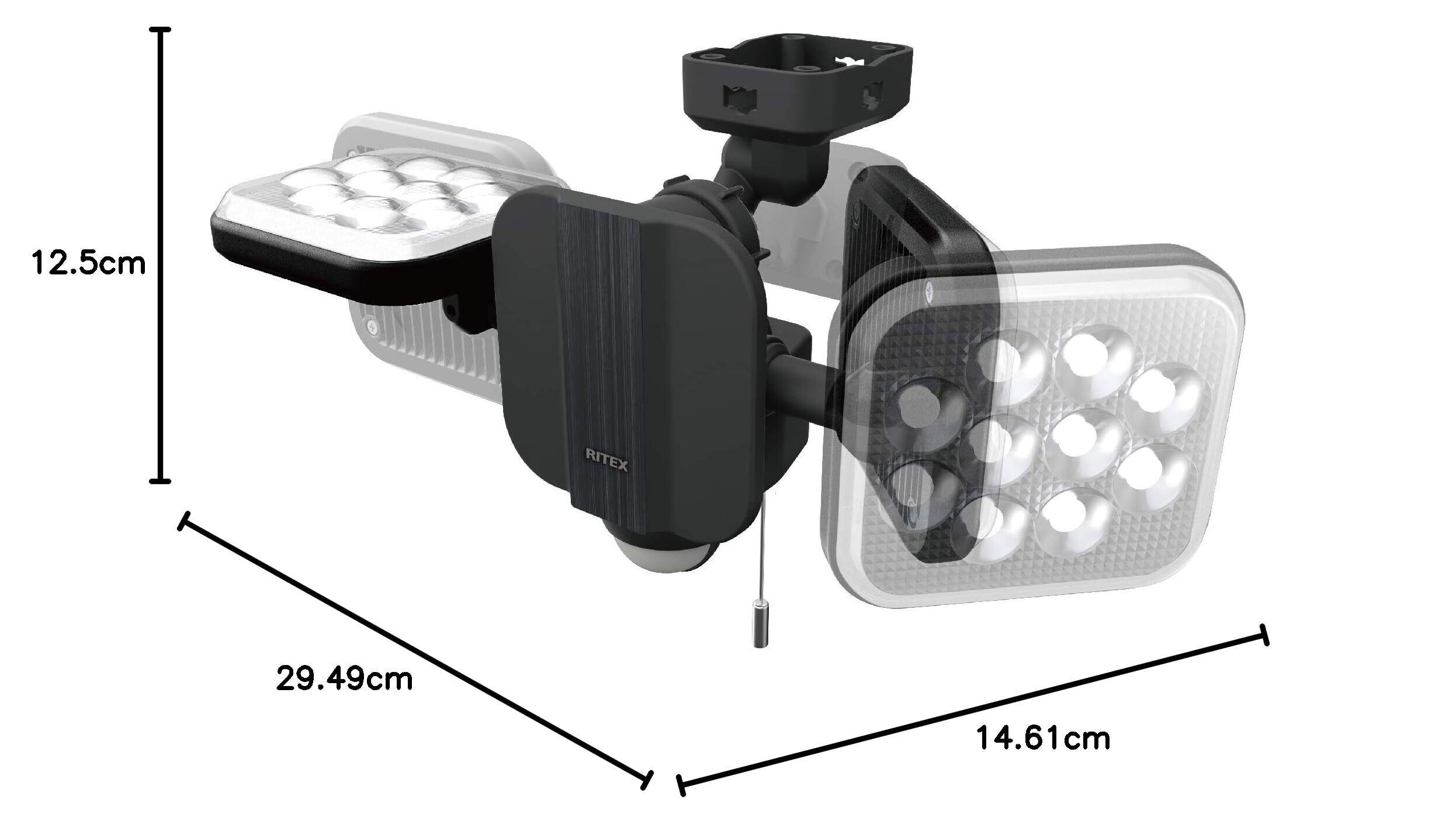 この「ムサシセンサーライト」は、**11Wの高輝度LEDを2灯搭載し、フリーアーム式により自由に角度を調整可能です!** 幅29.5cm、奥行12.5cm、高さ14.6cmのコンパクトデザインで、さまざまなスペースにフィットします。