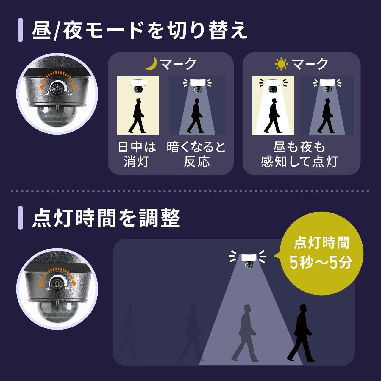センサーを搭載し、人を 感知 してライトを 自動点灯 させることができます。 人感センサー を 検知 する範囲を 調整 ができ、隣家や道路など検知範囲が設定できます。