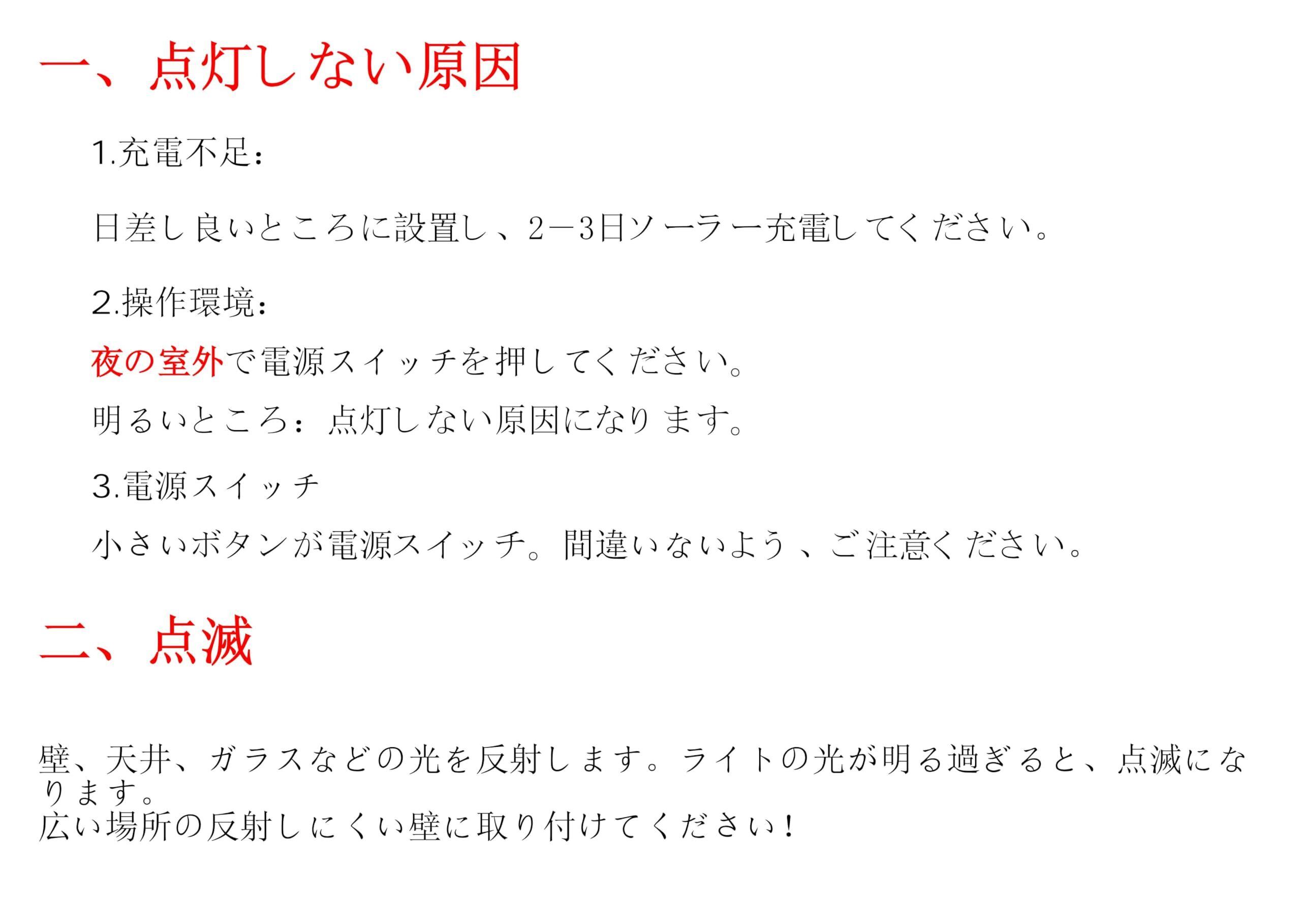 保護レベルIP65:ソーラーライトは良質なABSで作られていて、耐熱性を付ける。 プロのIP65保護レベルにより、ソーラーライトの内部は防水と防塵を付ける、屋外に長時間さらされた場合でも非常に明るい光度が維持できます。