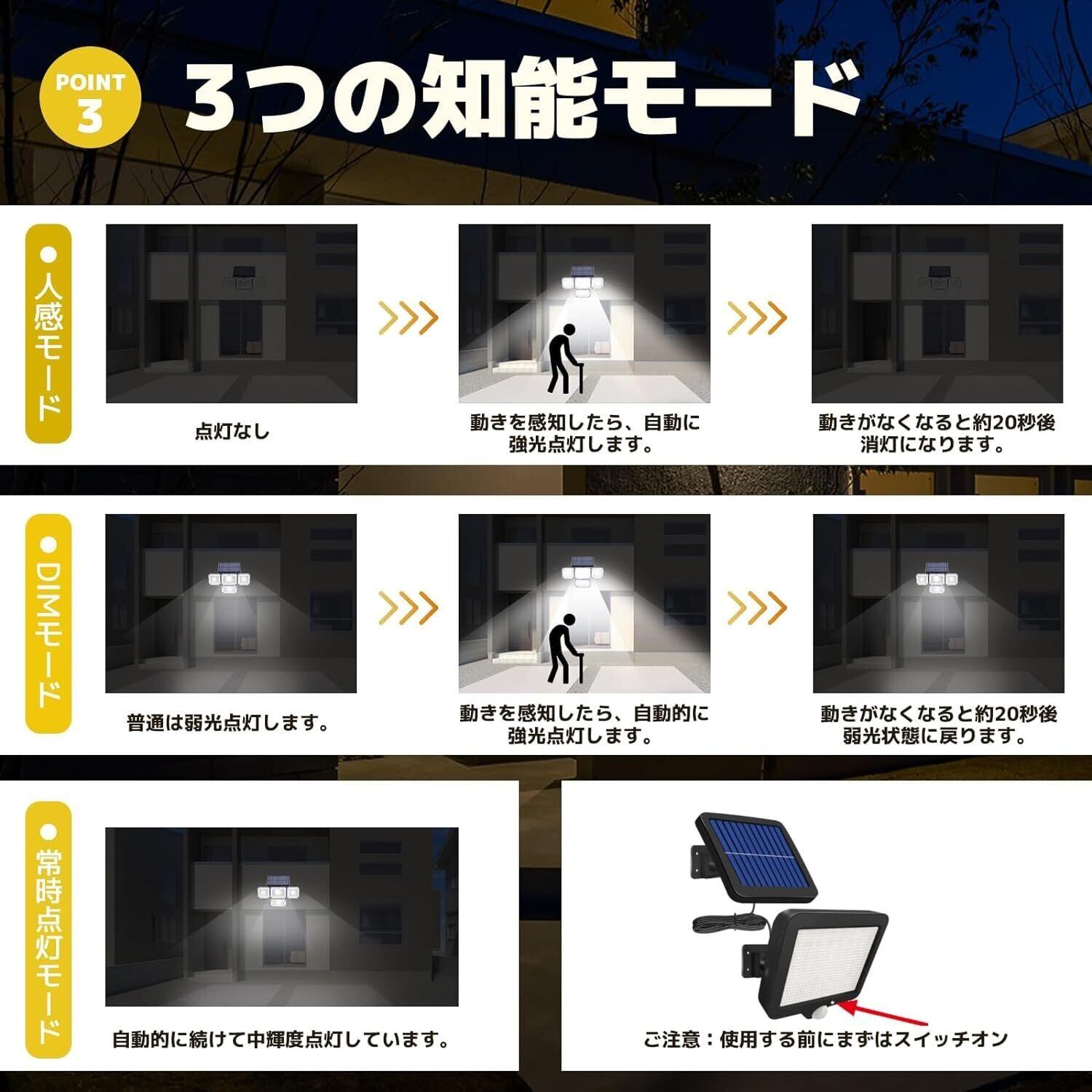 高品質のLEDライト:56個のLEDソーラーライトにより、検出と照明角度は120°で、より広い照明エリアを覆うし、広い範囲で最大限に明るさを提供します。これにより、夜間でも通行人に明るく安全な環境が作り出されます。
