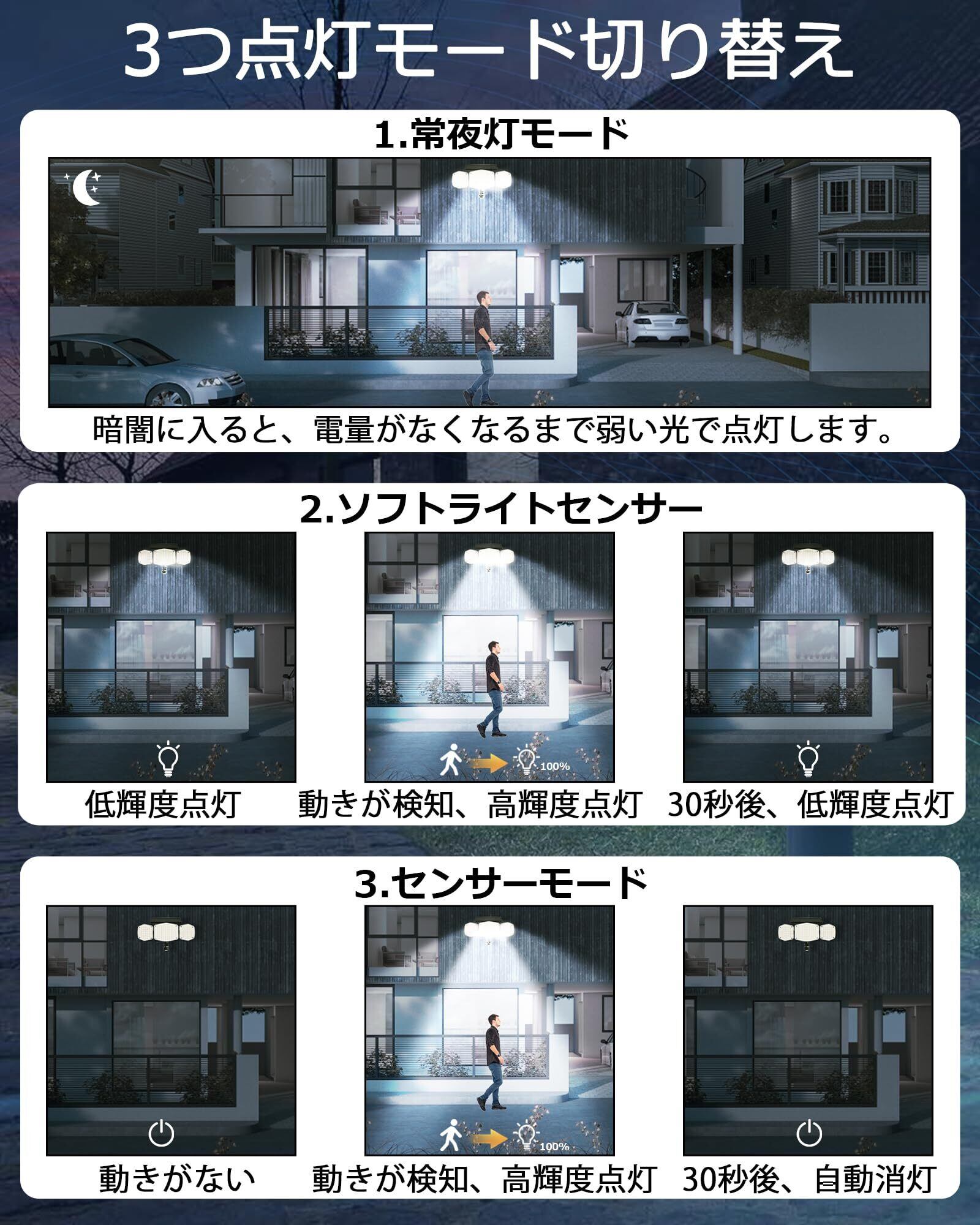※【三つ照明モード搭載したソーラーライト】常夜灯モード: 暗闇に入ると、電量がなくなるまで強い光で点灯します。DIMモード: 闇に入ると弱い光で点灯します。動きを感じされると強い光になり、15秒後、弱い光に戻ります。センサーモード: 闇になっても点灯なし。動きを感じされると強い光になり、15秒ご、消灯状態になります。
