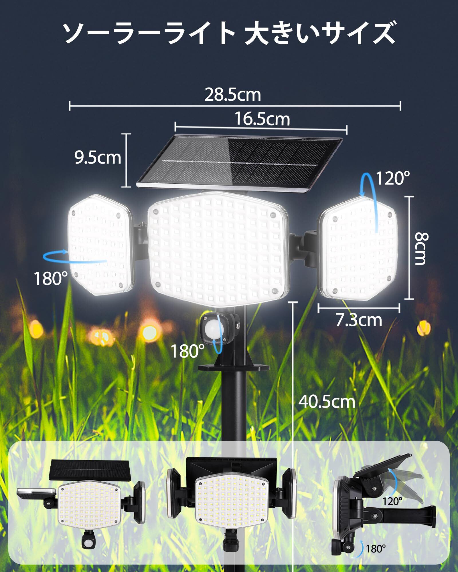 ※【3面発光で広範囲爆光照射】このソーラーライトは昼光色7000k超高輝度の208個LEDチップを搭載しており、最大光束で2100ルーメンを達し、光を無闇の空に散らずに照明したい場所をしっかり照らします。3面発光ソーラーライトが両側のライトは左右回転可能で、360°照明角度がに達し、夜間センサーライトの照明範囲が大幅に広くなります。