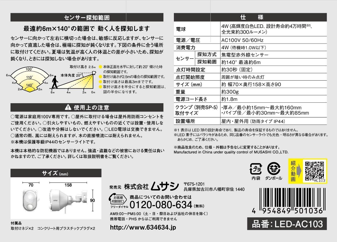 ムサシ RITEX フリーアーム式LEDセンサーライト(4W×1灯)防雨タイプ コンセント式 ホワイト LED-AC103