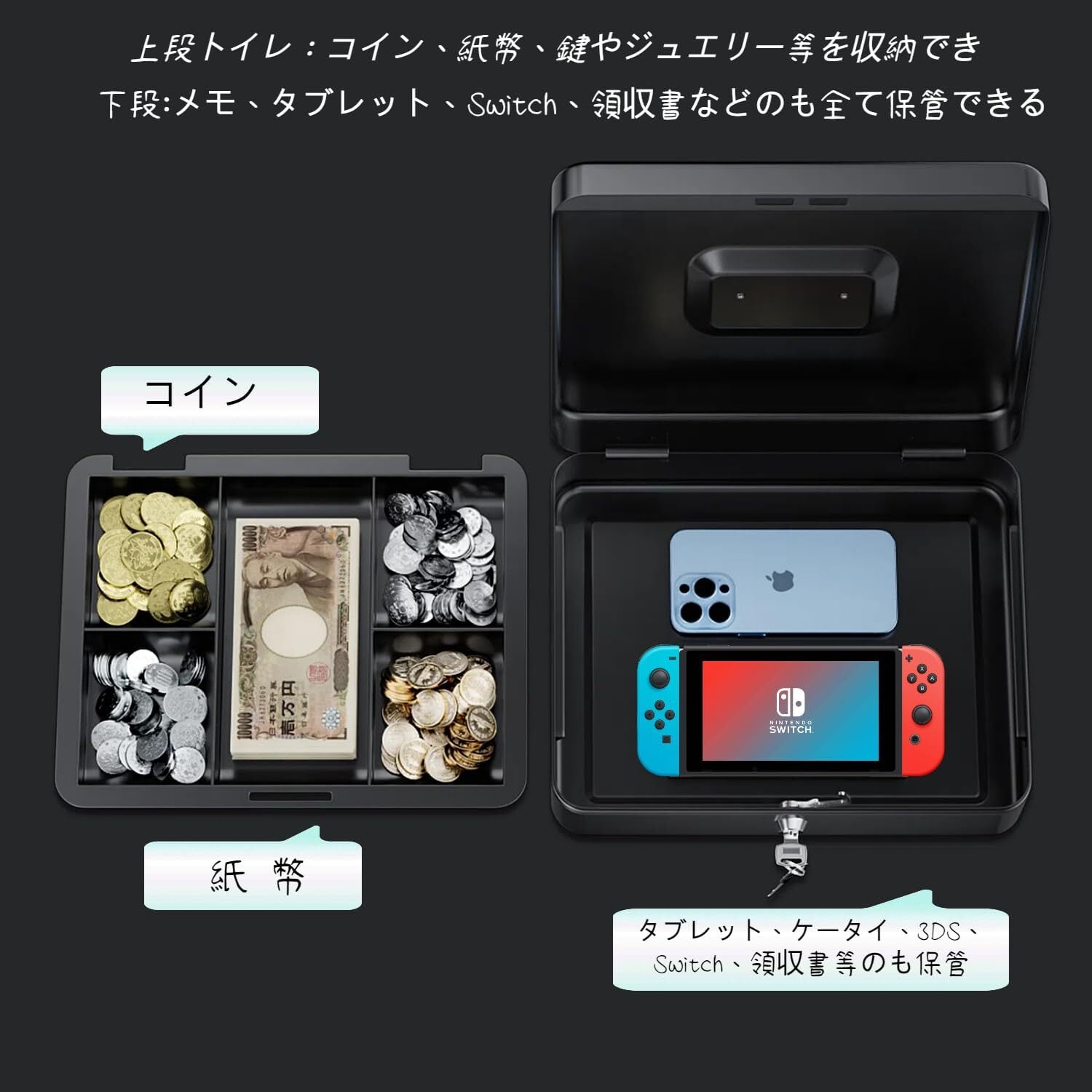 Point 4【多彩なニーズに応える上段トレイと下段設計】 本体サイズにあわせて設定された上段トレイは、硬貨収納用と、壱万円紙幣を折らずに収納できる、鍵やジュエリー用の5つのコンパートメントがあります。下段はタブレット、ケータイ、3DS、Switch、領収書などのも全て保管できるサイズです。様々な用途に合わせて選べます。
