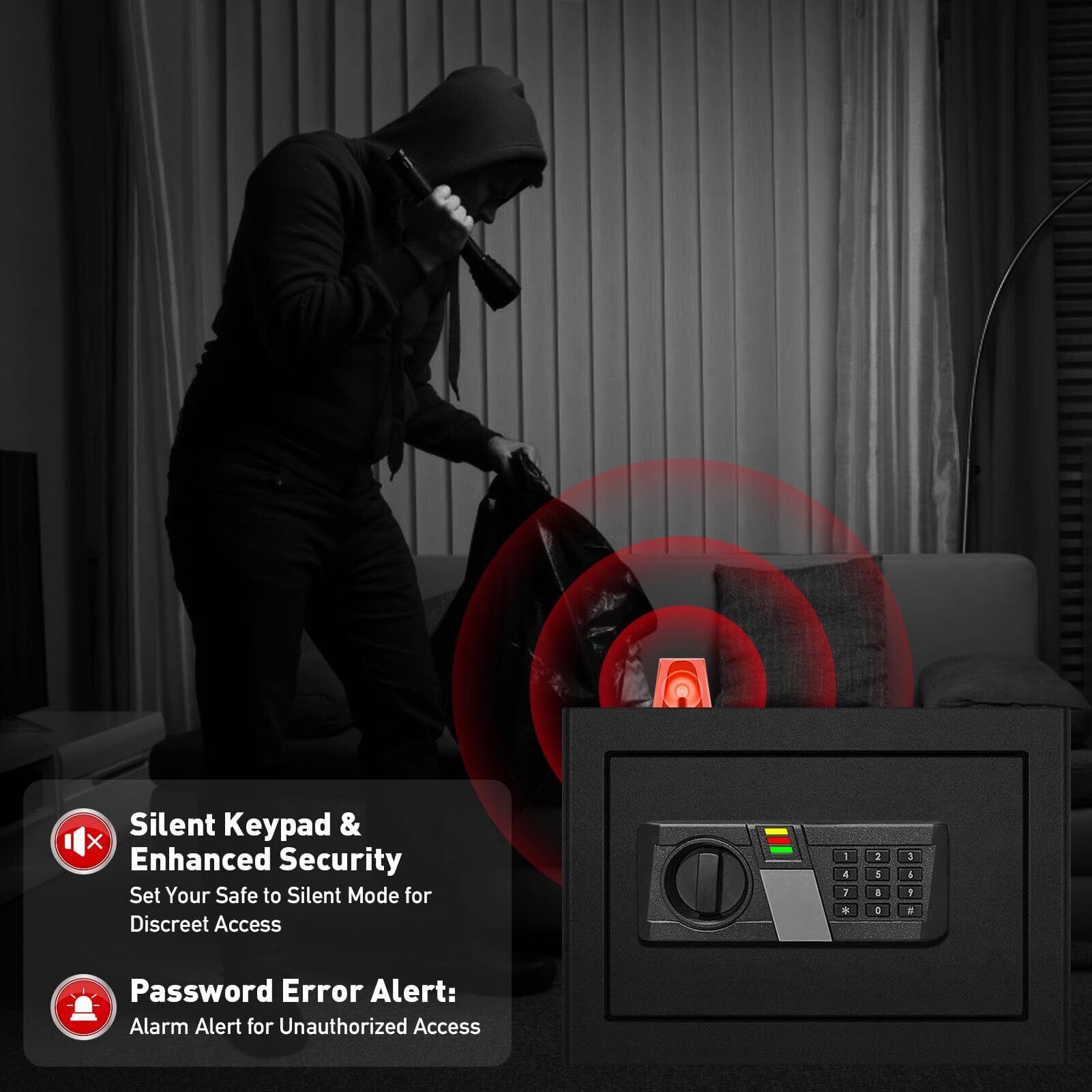 安全【スマートアラームシステム&サイレントモード】: 耐火性の金庫で、不正アクセスは過去のものになります。 誤ったパスワードを3回試行すると、システムは20秒間ロックされます。 誤って6回試行すると、300秒間ロックされます。 安全(鍵を使ってドアを開け、電池を動かしてアラームを止めることができます)。 安全サイレントモードでは、パスワード入力が気付かれません。