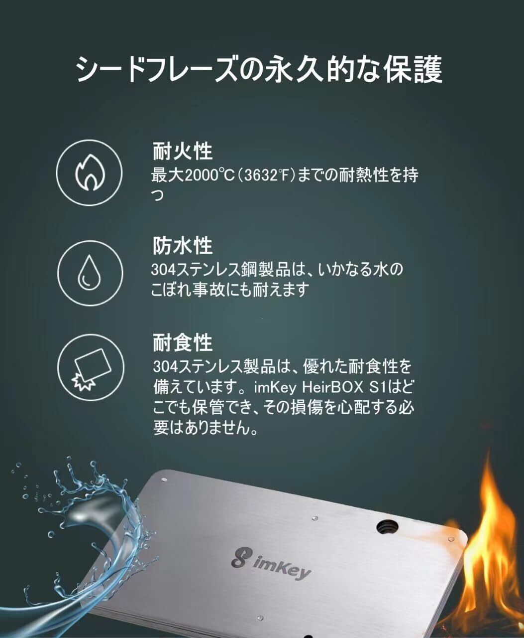 耐火・耐水・防錆の304ステンレス製|極限環境でも保護:最高2000°Cの耐熱性と完全防水構造で、火災や水害から大切な資産情報を守ります。