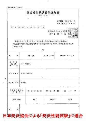 公益財団法人日本防炎協会による防炎性能試験に適合(試験番号 FO080007)(内容液を綿布に浸漬させた状態で、消防法施行令第4条の3の条件による)