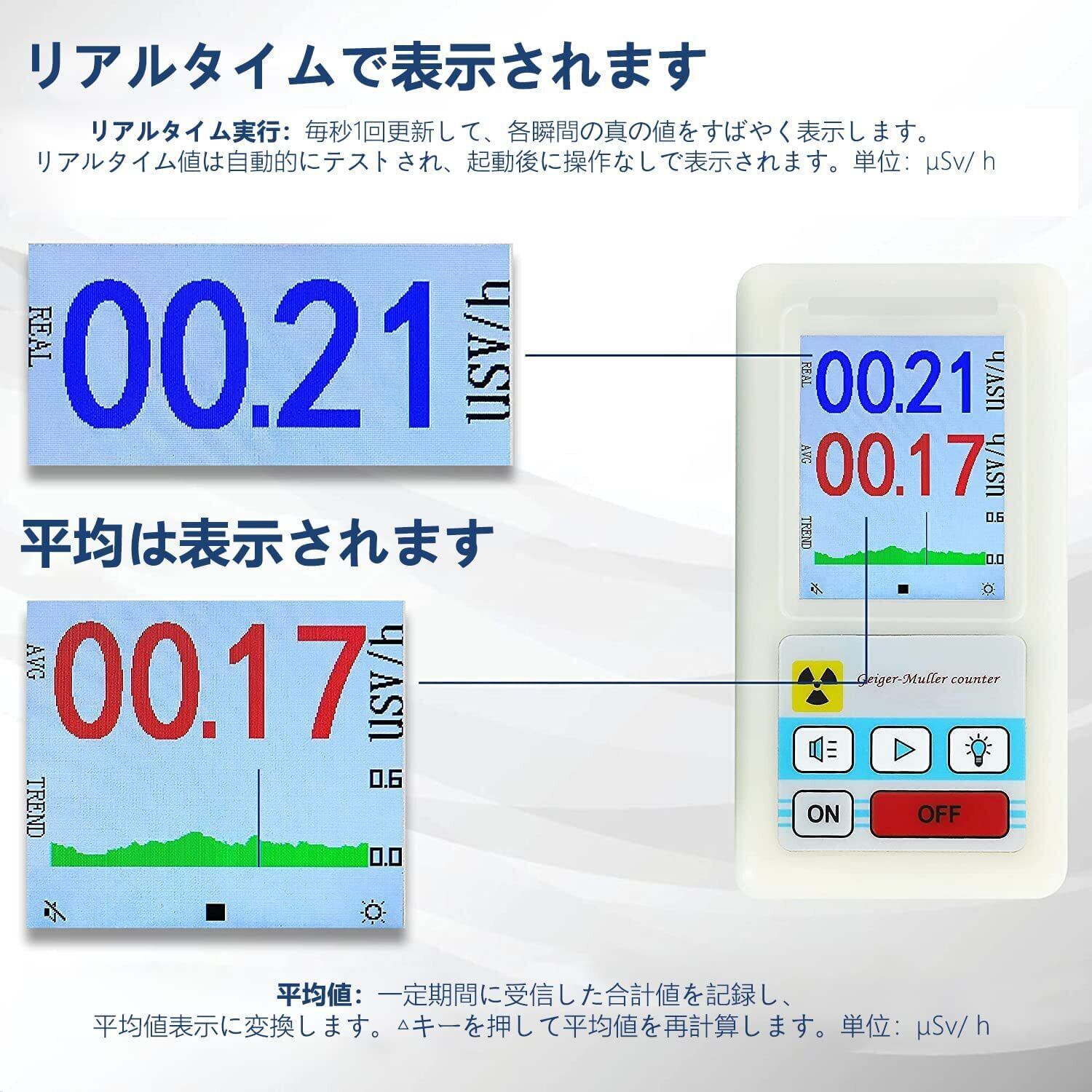 C【2つの測定モード】リアルタイム測定と平均値測定の2種類測定モードがあり、すぐに放射線の量をわかる必要な緊急の場合はリアルタイム測定値、日常の場合は平均値を確認して、場面によって使えます。 ※平均測定値は起動後に数分間測定してから表示されます。