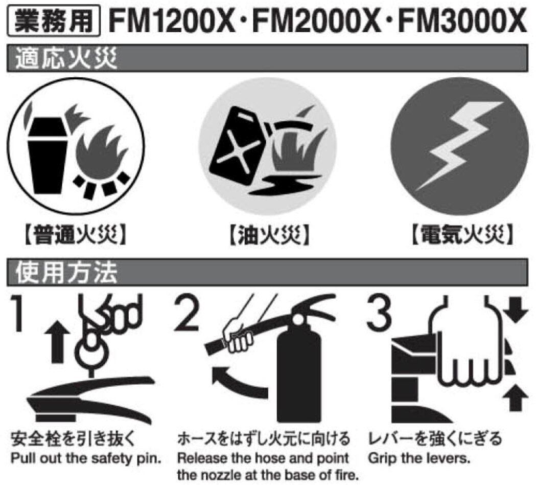 **操作説明が明瞭で誰でも簡単に扱える設計!** 万が一の火災に備えて、使い方が一目でわかるため、迅速な行動が可能です。