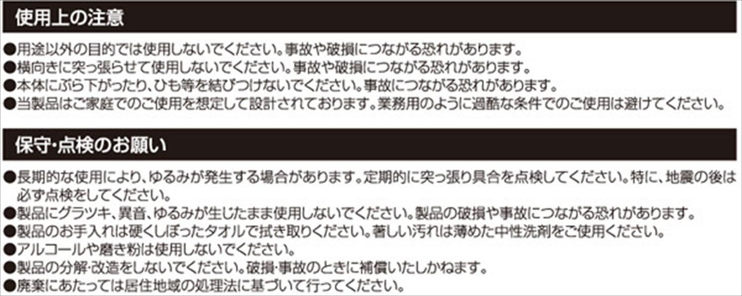 本製品は、希望の長さに調整した後、天井と家具の隙間にしっかりと差し込んで固定してください。取り付け後は定期的に設置状態を確認し、安全にご使用いただくことが重要です。