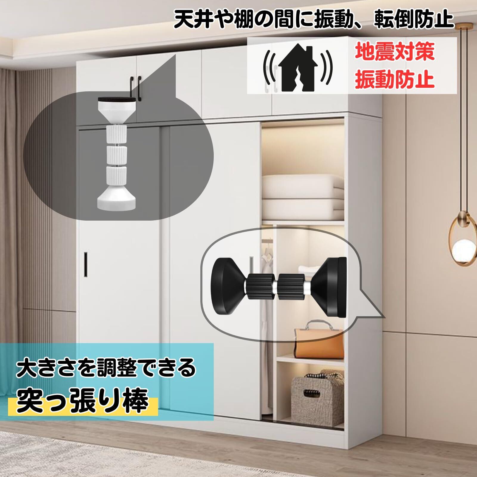 【両面テープで簡単取付、家具転倒防止突っ張り棒】防災用品。耐震グッズ。両面テープが付いており、簡単に取り付けできる家具用転倒防止つっぱり棒です。地震発生時家具の揺れや転倒を予防するための役割がします。ベッド、タンス、テーブル、本棚、食器棚、冷蔵庫など広い場所に使われています。天井や壁に挟むことで家具の転倒を効果的に防止し、地震発生した時家具や屋内の被害を最小限に抑える防災グッズです。【取り付け簡単】両面テープが付いており取り付けは簡単で、他の工具を使う必要もなく、適当な位置に置いてネジを締めるだけです。つっぱり式で取り付けカンタンな耐震ポール。