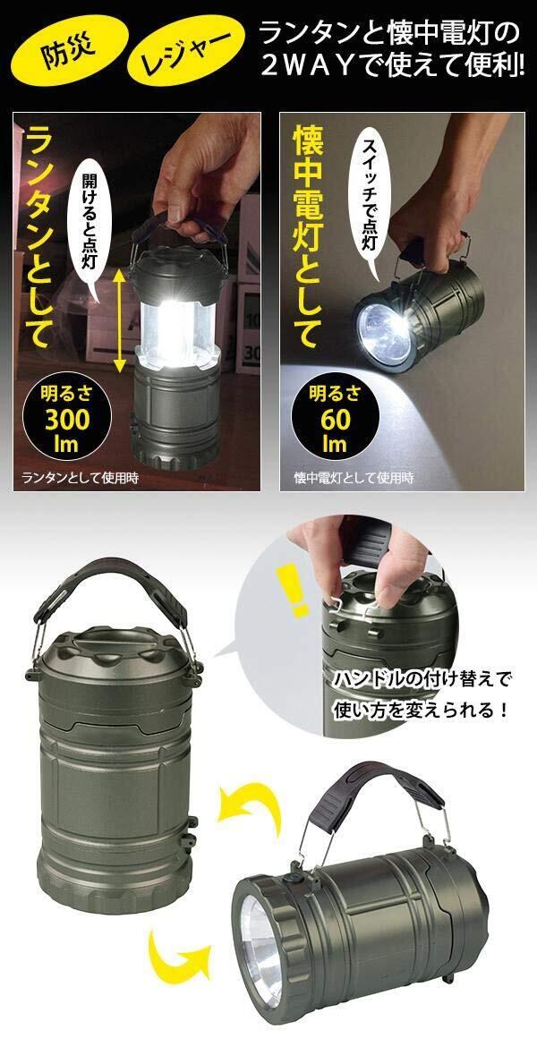 電源:単3形アルカリ乾電池×3本(別売) 、連続点灯時間:約24時間※新品の単3形アルカリ乾電池を使用してライトが完全に消灯するまでの目安です。 、光源:COB-LED LIGHT 、明るさ/ランタン:300lm、懐中電灯:60lm