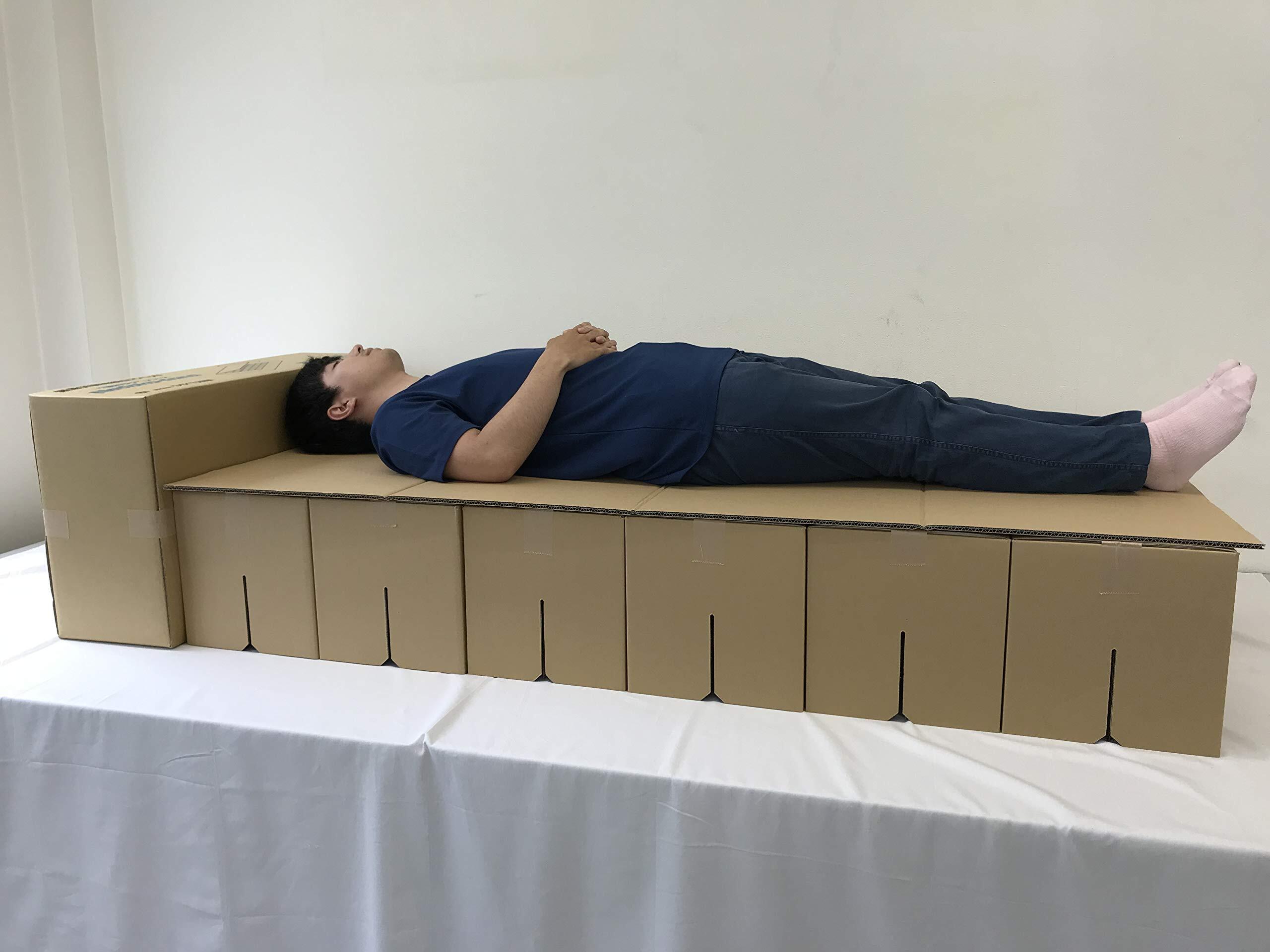災害時、避難先でも使える組立てベッド。頑丈で長期使用も可能な強化段ボール製組立式。強化ダンボール製のため、大柄な成人男性でも問題無くご使用いただけます。