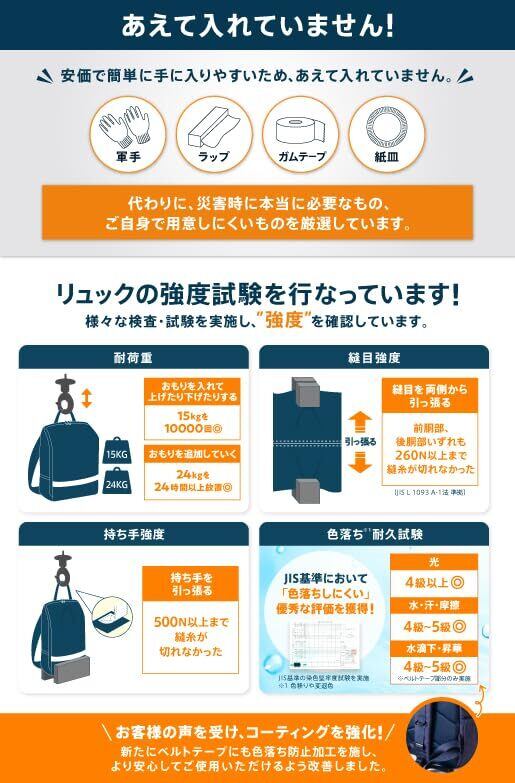 **リュックの内容には、必要な食料や水、衛生用品など、実用的なアイテムが揃っています!** 各アイテムは、災害時に便利で使いやすさも考慮されていますので、不安な状況でも安心してお使いいただけます。