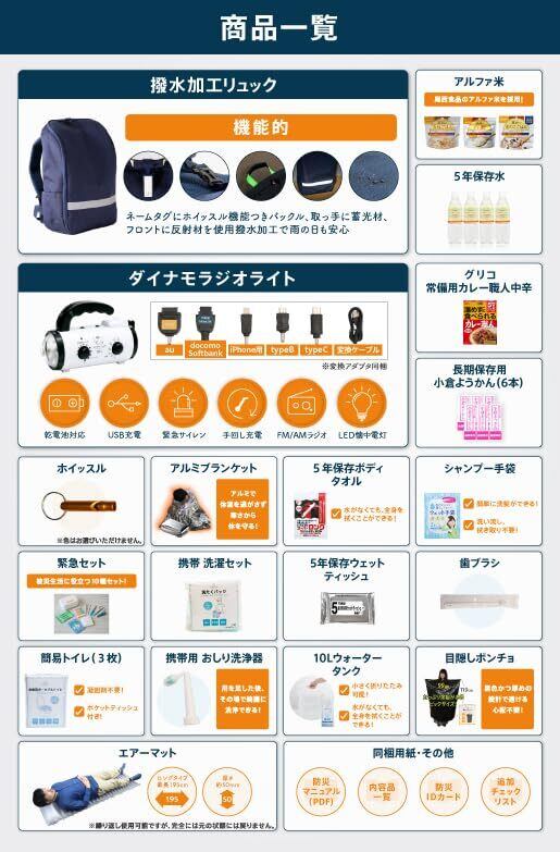 付属コンポーネント ウェットワイプ, ウォータータンク, エアーマット, トイレ, ブランケット, ポンチョ, ラジオ, 水, 米, 防災リュック