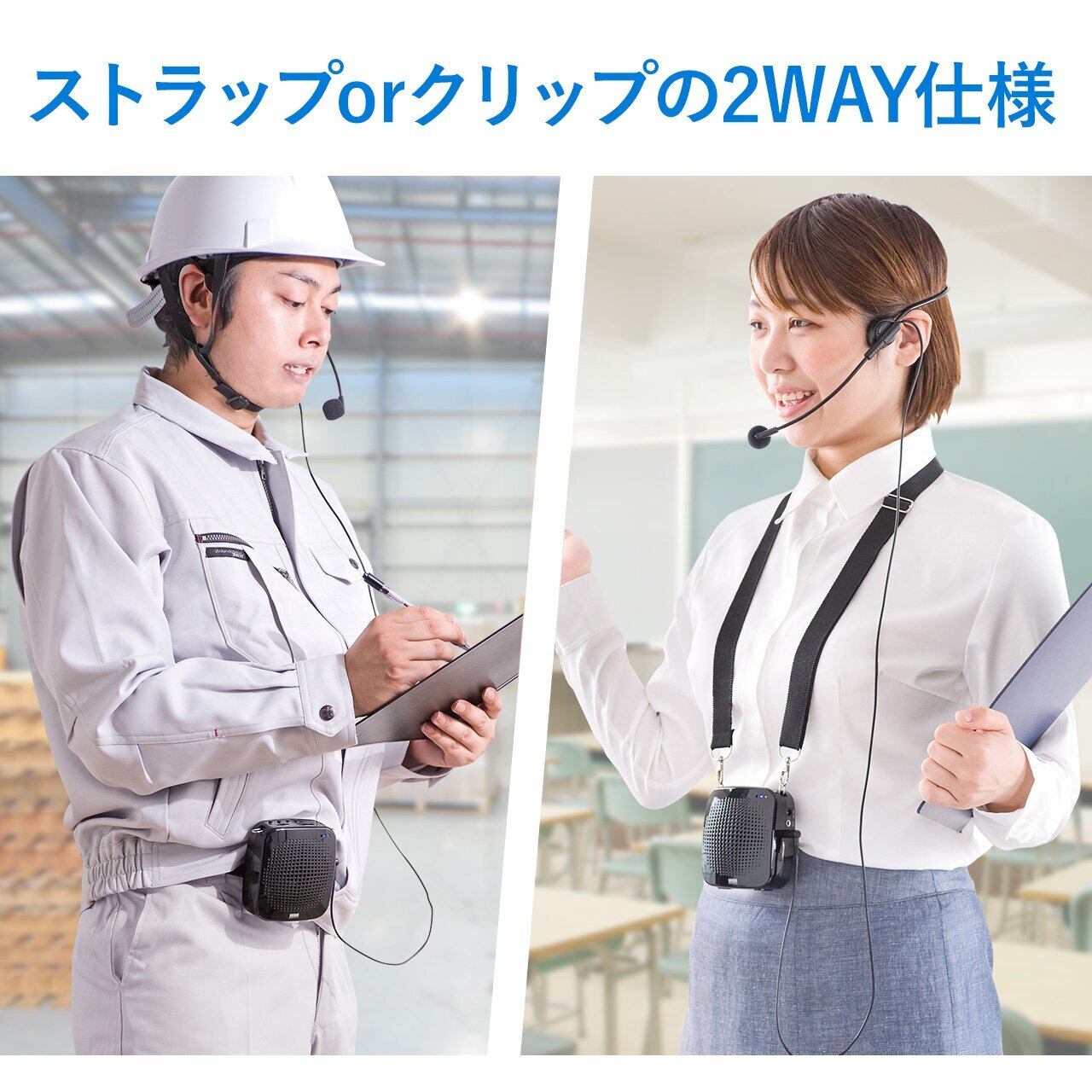 幅8.9cm、高さ9.8mのコンパクトサイズスピーカーと、ケーブル長約1mのヘッドマイクで、様々なシーンでアクティブに使用することができます。クリップでベルトへの取り付け、ストラップを使用して首からぶら下げてしての2WAY仕様で、お好みの使い方が可能です。