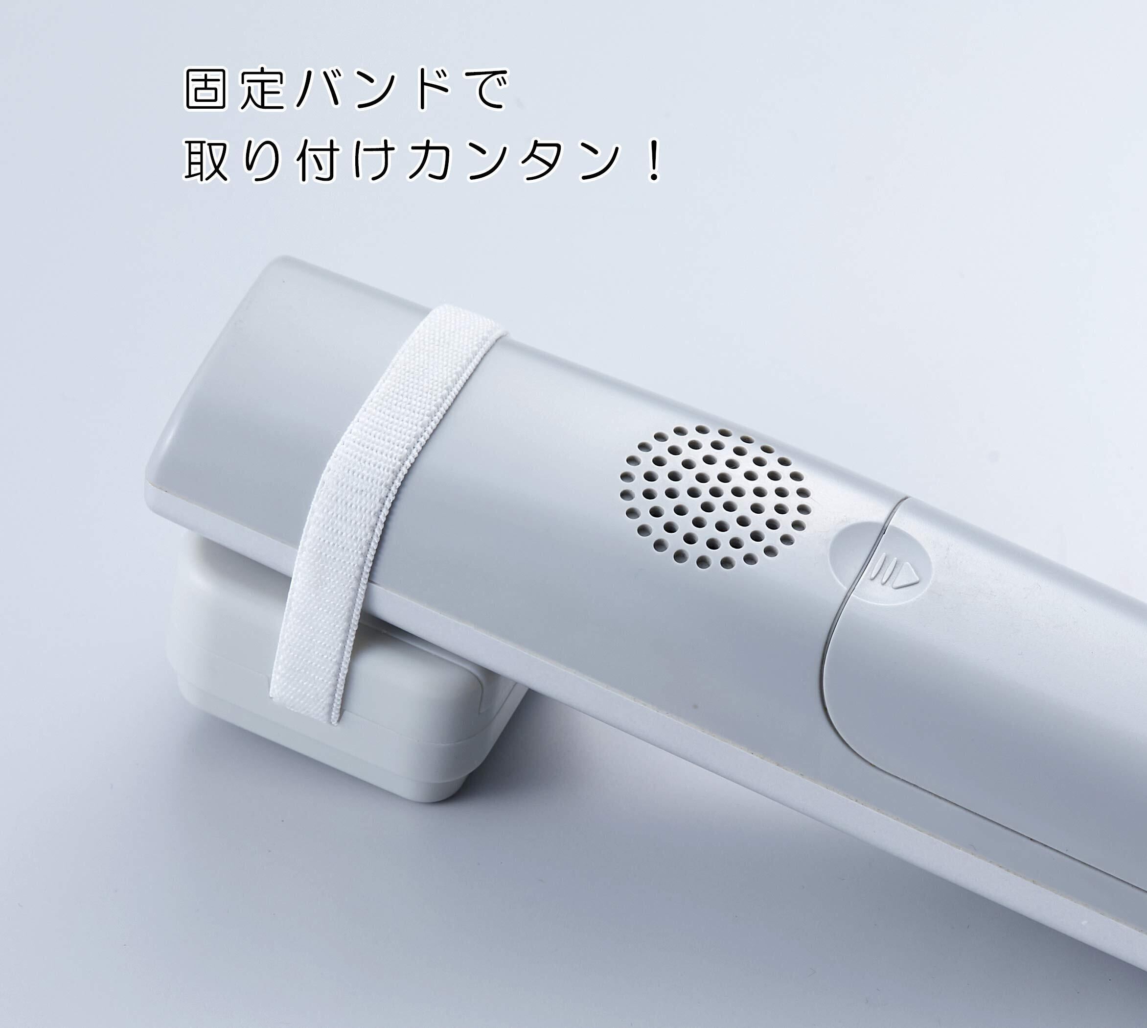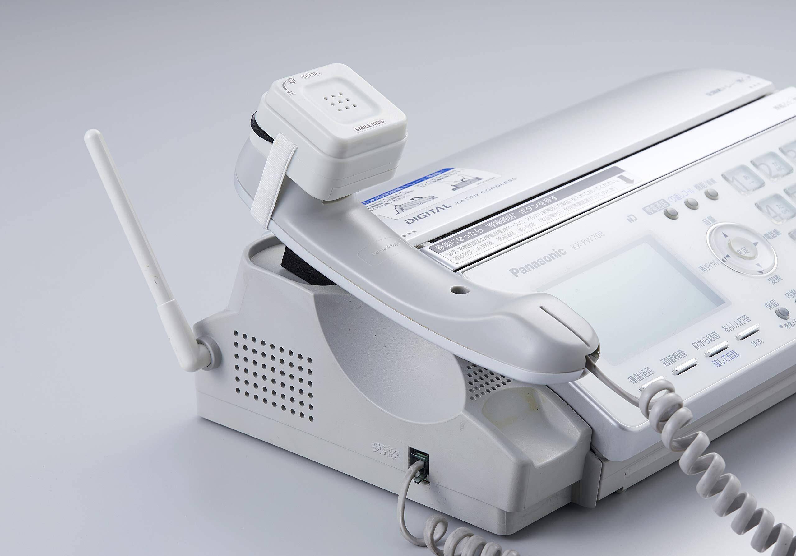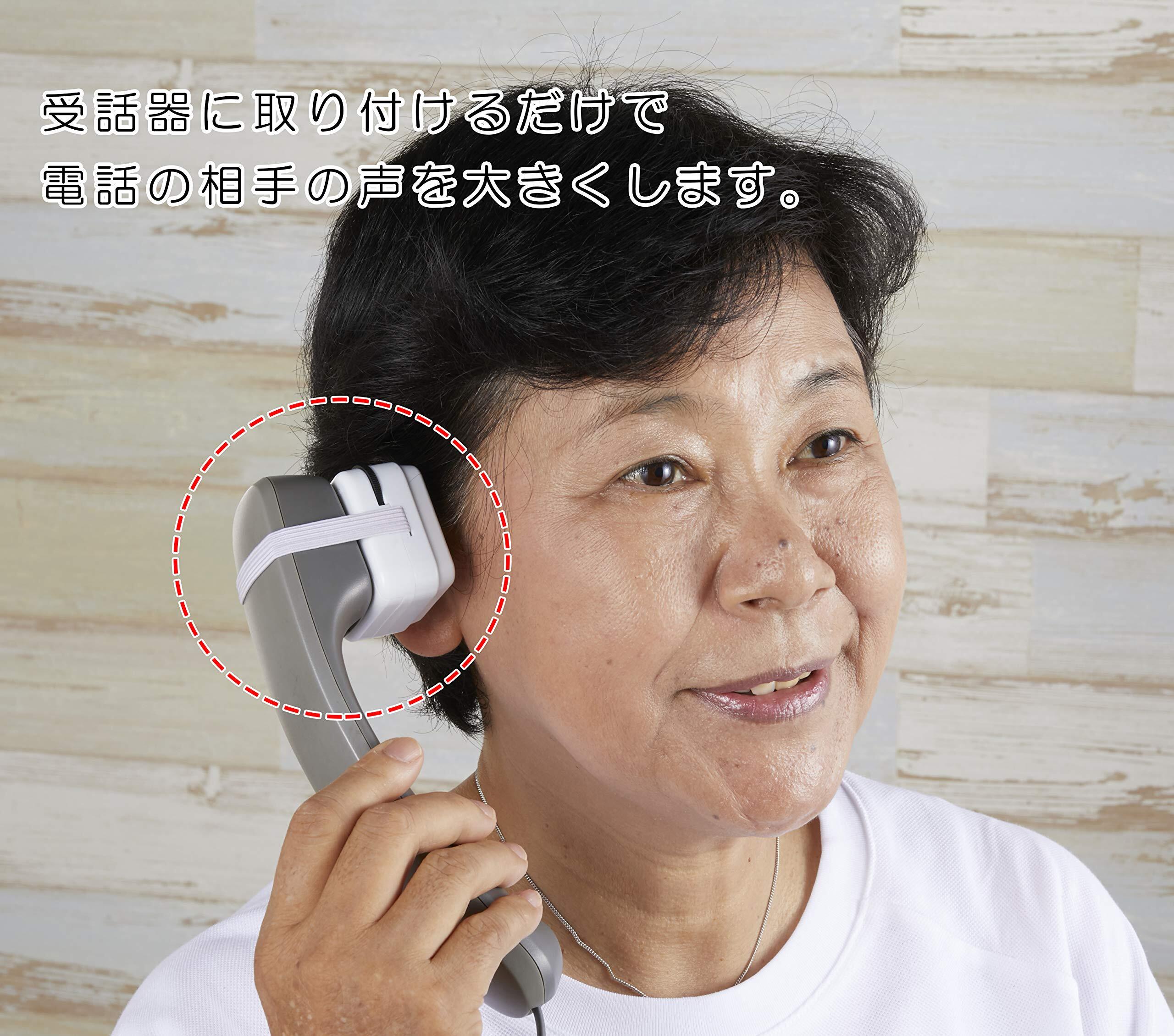 ゴムバンドで取付簡単。受話音量は最大30倍。置けば自動でオフ、持ち上げれば自動でオンの簡単操作。子機にもスマホにも対応