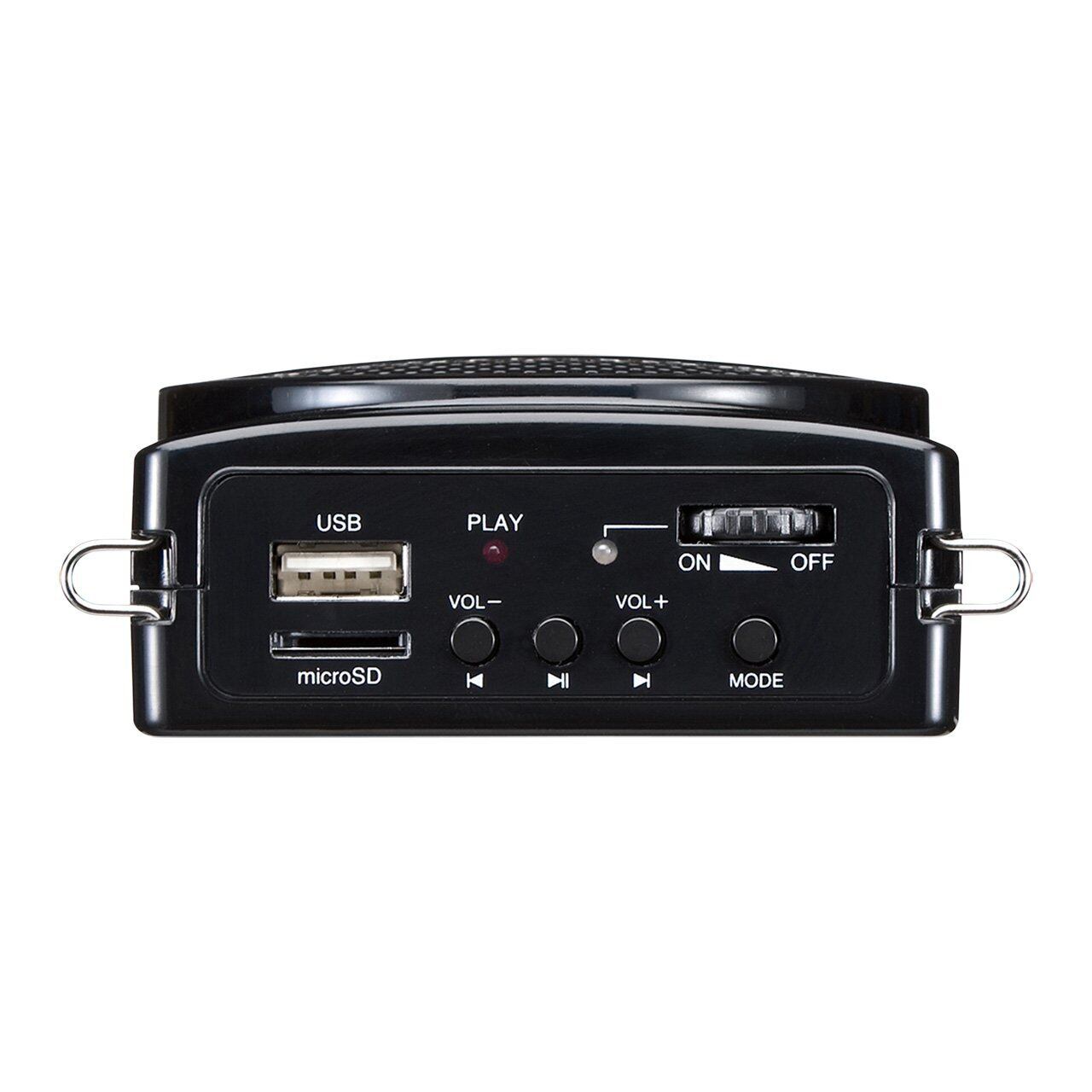 電源を入れ、マイクに向かって話すだけで音声拡声の準備が完了します。音楽を流す場合にはUSBまたはmicroSDカードを挿入し、再生ボタンを押すことでお楽しみいただけます。