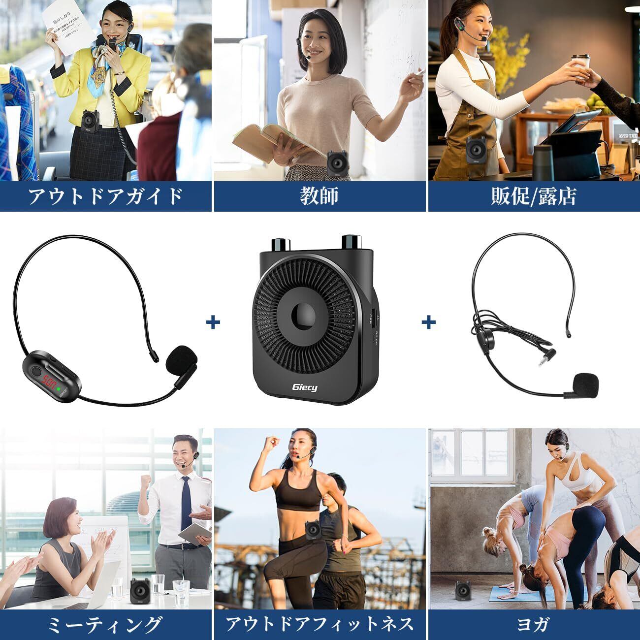 【】Giecyは一年の保证期间を提供いたします。ご使用中にご不明な点がございましたら、お気軽にお問い合わせください。パッケージ内容:拡声器x1、有線ヘッドマイクx1、ワイヤレスマイクx1、AC-DC充電器x1、調節可能なウエストストラップx1、 説明書x1