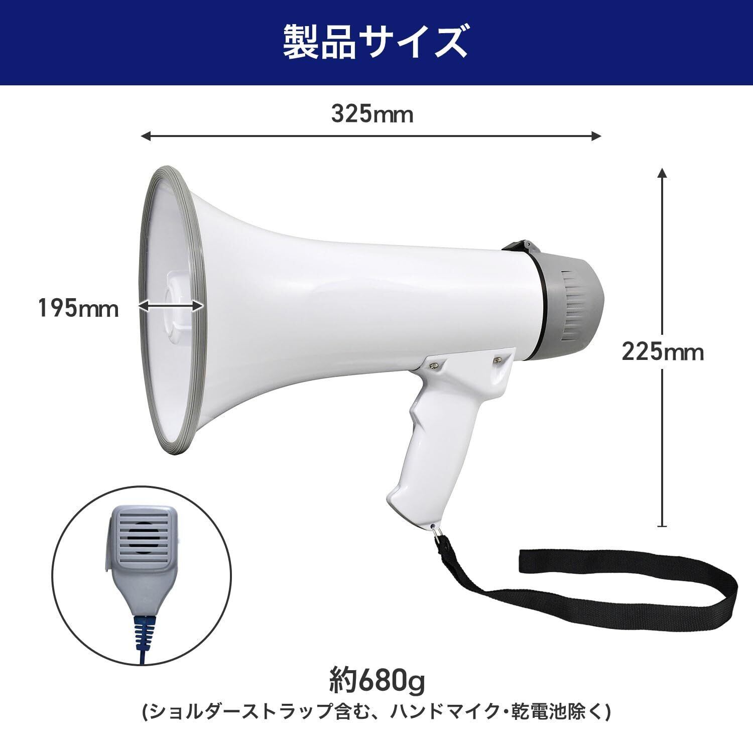 ■使用電池:単一形アルカリ乾電池×6本(別売) ■連続使用時間:約23時間(音量最大アラーム時) 約13時間(音量最大サイレン時) ※アルカリ乾電池使用時 ※電池の性能、使用条件により連続使用時間は短くなる場合があります。 ■出力:最大20W ■有効距離:約200m(音量最大アラーム、サイレン時) ※アルカリ乾電池使用時 ※周囲、使用の状況により有効距離は短くなることがあります。 ■音量:105dB/m(音量最大アラーム、サイレン時) ※アルカリ乾電池使用時 ■マイクロホン:コンデンサーマイクロホン ■外径寸法(約):幅325×高さ225×奥行195(mm)(最大値) ■質量:約680g(ショルダーストラップ含む、ハンドマイク、電池除く) ■付属品:ショルダーストラップ、ハンドマイク
