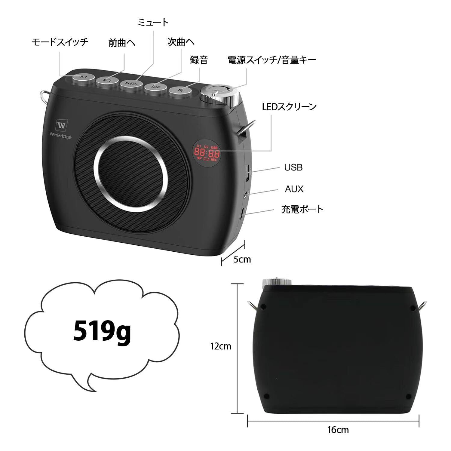 多機能再生と録音:歌の繰り返し、ループ再生、AUX再生、USBドライブ対応音楽再生、録音機能でプレゼンテーションをキャプチャできます。
