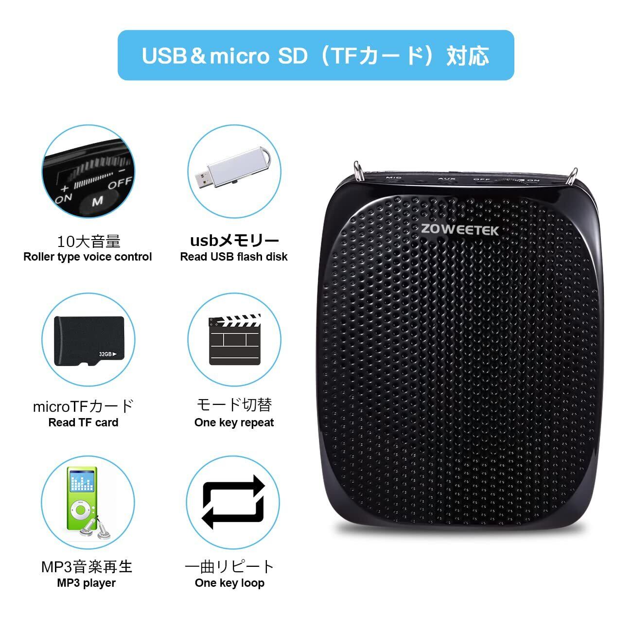 ZOWEETEK 拡声器 ハンズフリー ポータブル拡声器 小型 ミニ 原音再生 大音量 メガホン 有線マイク型付き 原音再生 USBメモリー・microSDカード対応 ヘットマイク拡声器 イベント、講演、運動会、店頭販売、街頭演説、観光ガイドなどに最適!!(黒 )