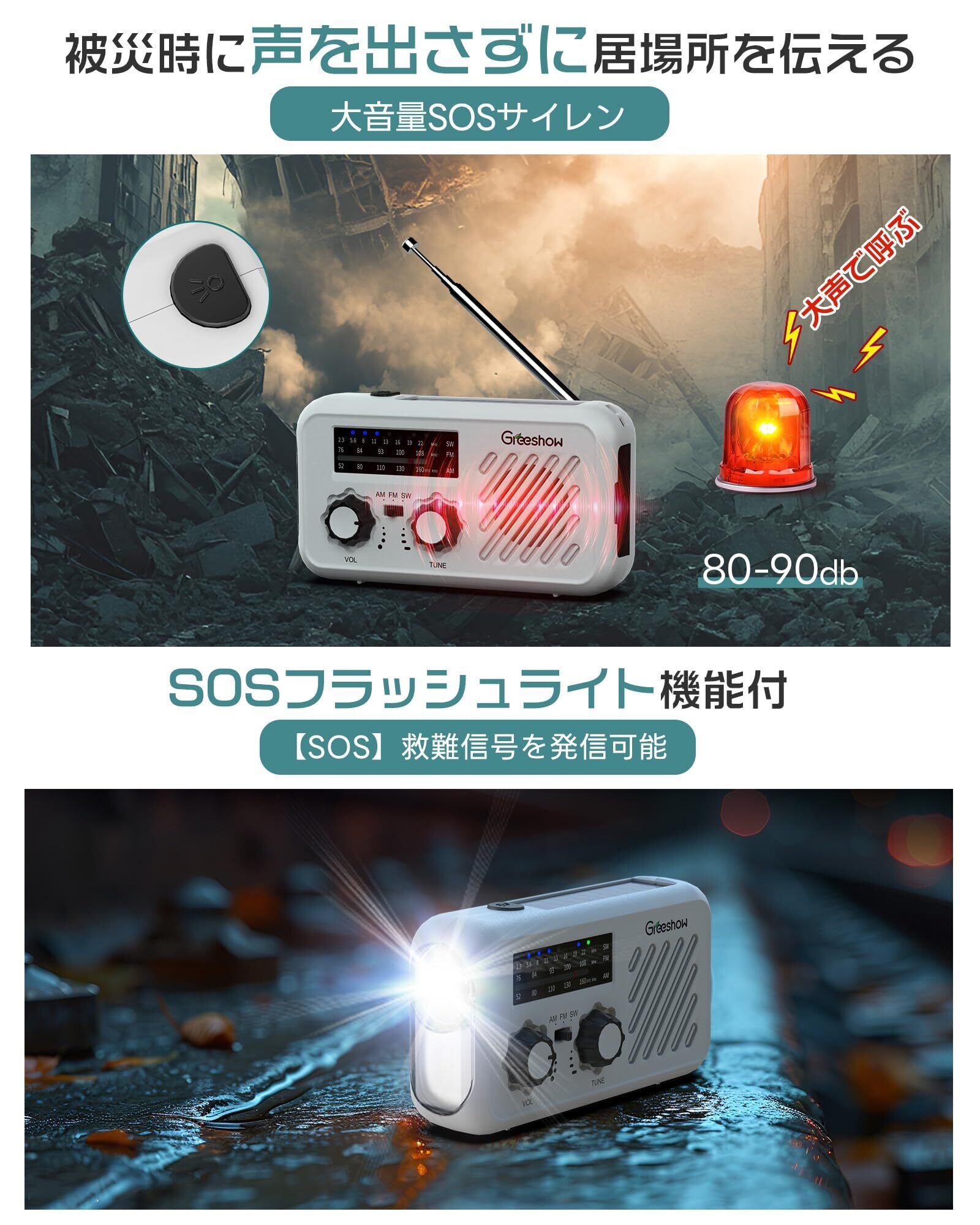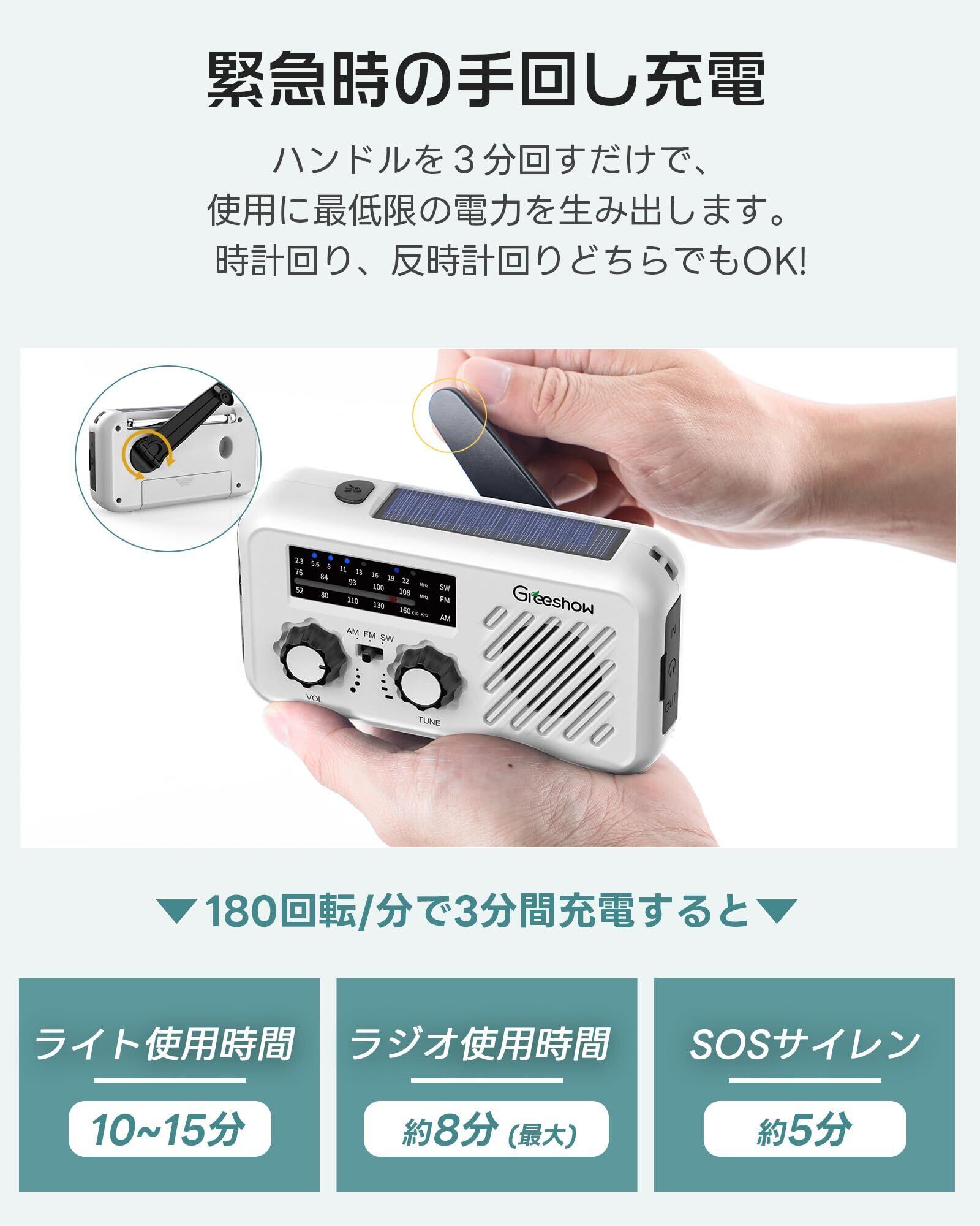 この「Greeshow 防災ラジオ」は、**手回し充電やソーラー充電に対応しており、万が一の災害時にも安心して使用することができます!** SW/AM/FMのラジオ受信機能が搭載されており、最新の情報をしっかりキャッチできます。