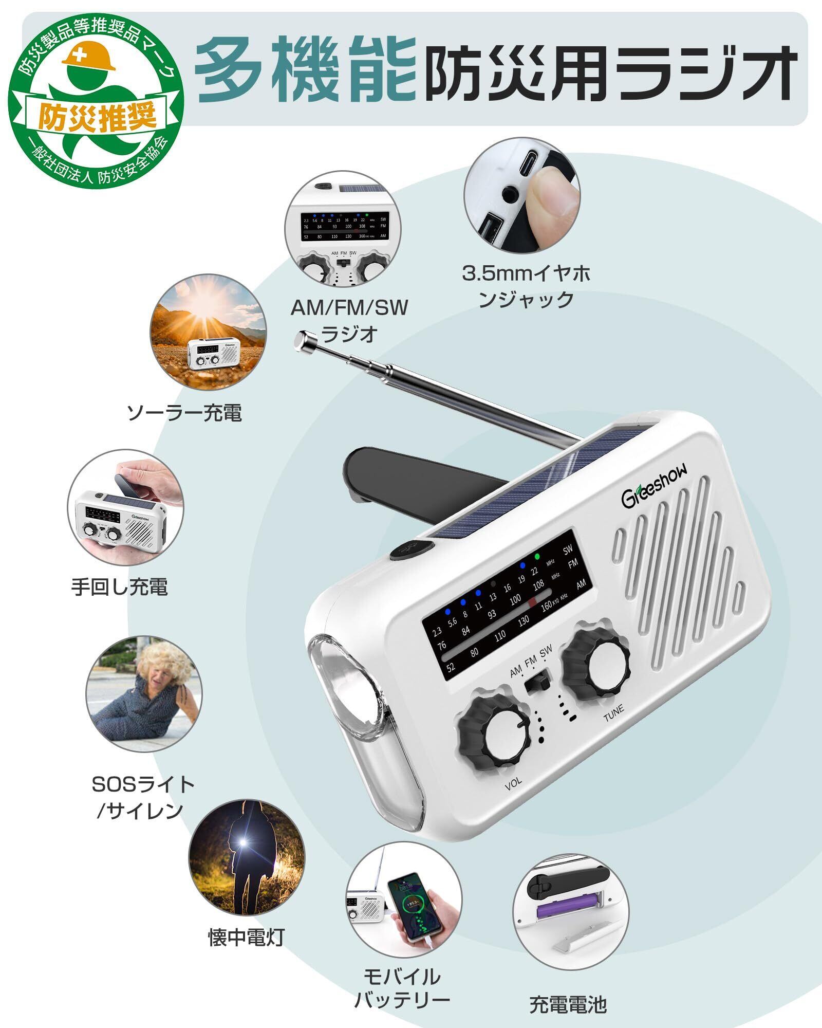 【防災安全協会推奨品認証】Greeshow 防災ラジオ 多機能 携帯ラジオ 手回し充電・ソーラー充電対応 SW/AM/FM受信 LEDライト 手回しラジオ(FM:76-108MHz) SOSアラート スマホ充電 3.5mmイヤホン対応 2000mAh 防水 小型 USB充電 懐中電灯 防災グッズ 地震 台風 緊急対策 日本語説明書付 GS-297(ホワイト)
