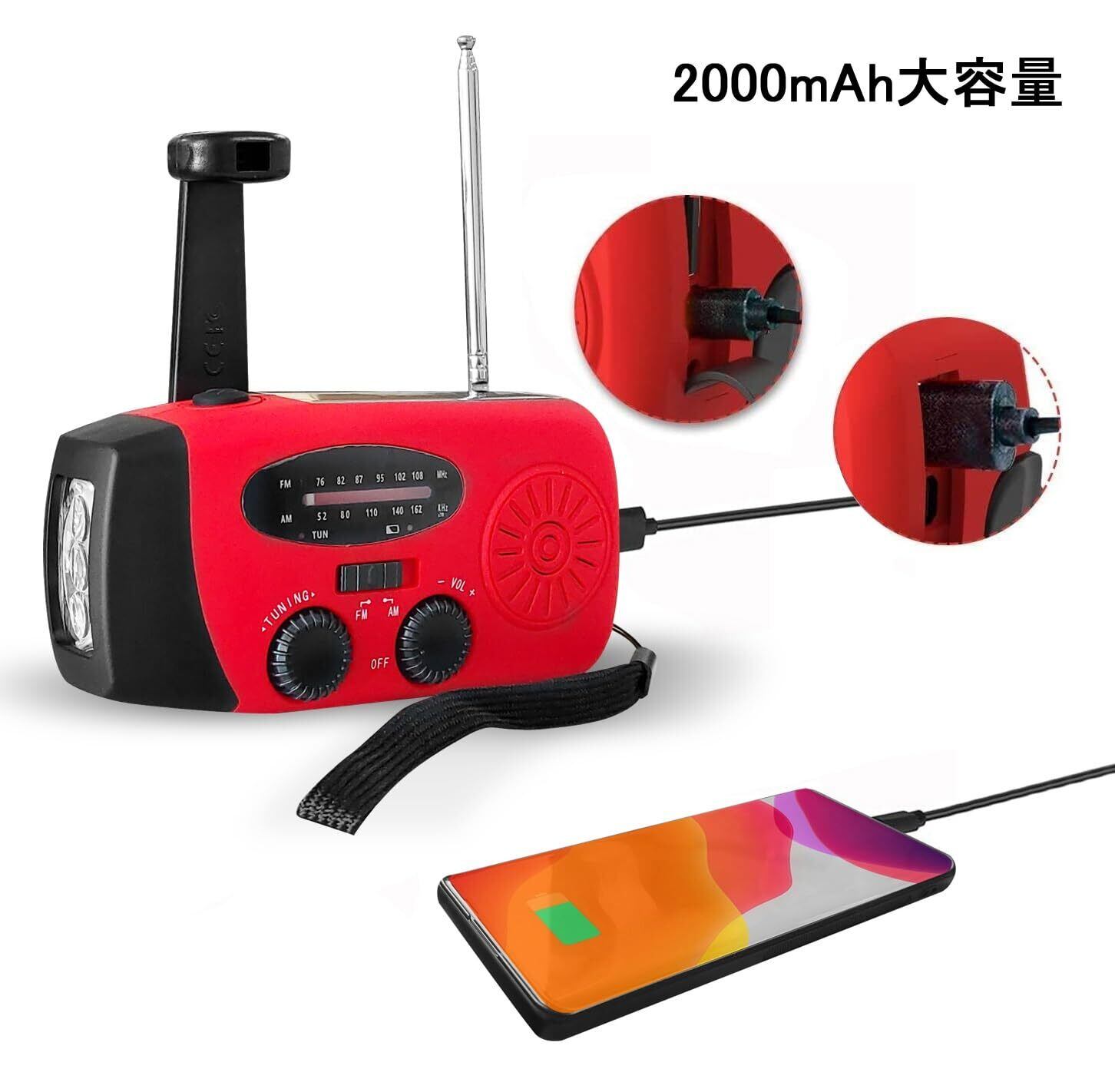 DR.TREE【緊急防災 3WAY充電】ラジオライト 防災ラジオ ストラップ付け ソーラー/手回し発電 USB充電 非常用照明器具 災害用 防水 コンパクト 大容量2000mAh 懐中電灯 AM/FM対応 防災グッズ 地震 震災 津波 台風などの緊急対策 赤い