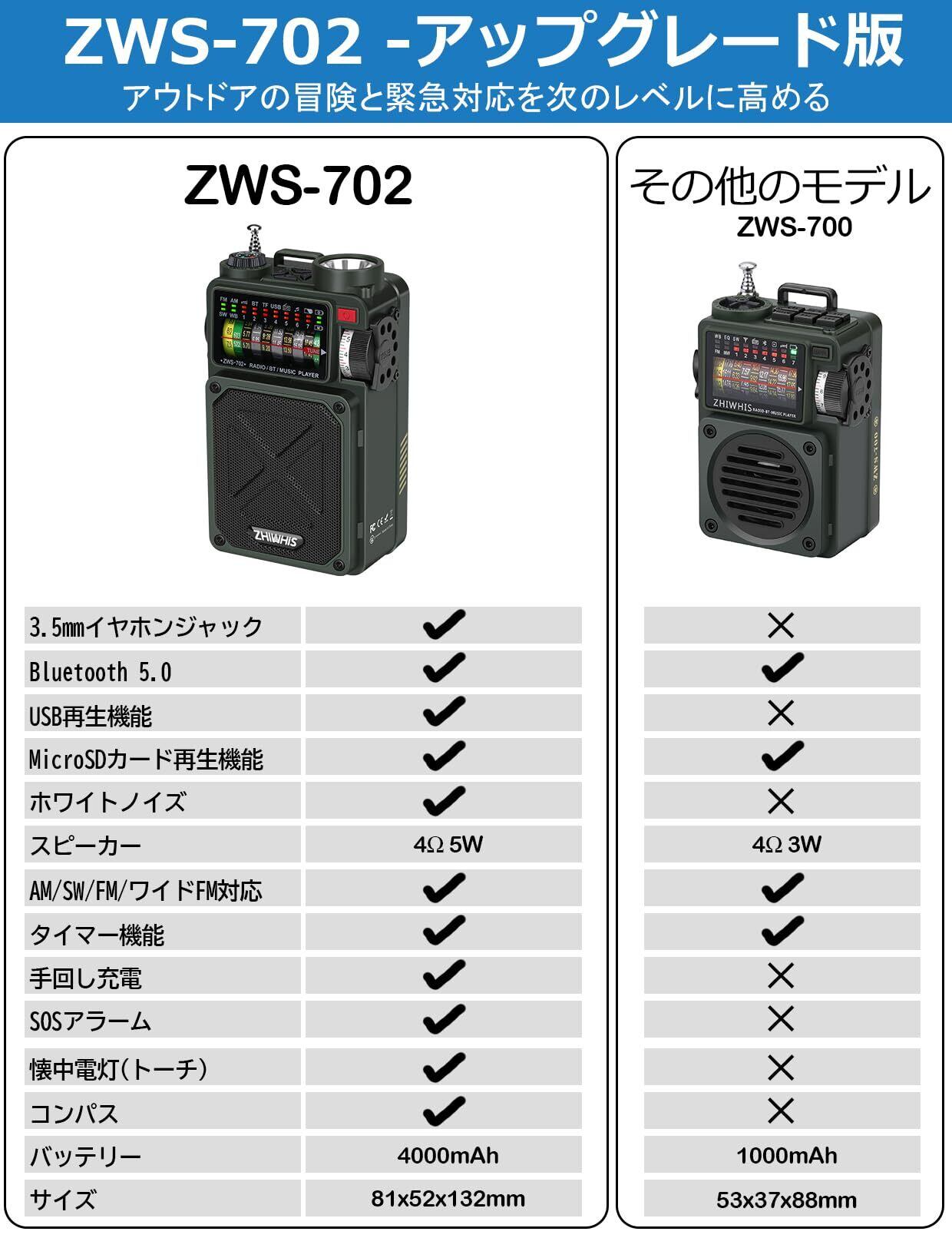 ZHIWHIS Bluetoothスピーカー 防災ラジオ FM/AM/短波/ワイドFM対応 懐中電灯 ソーラー/手回し/USB-C充電【SOSアラート/USB再生対応可能/MicroSDカード対応/32時間連続再生/タイマー/技適取得済 アウトドアZWS-702
