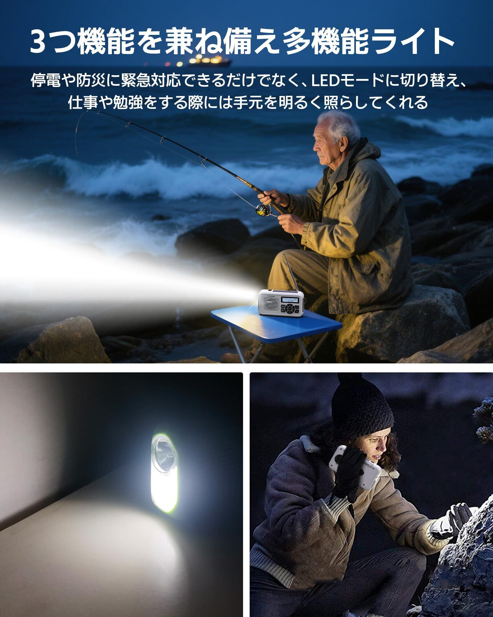 **この防災ラジオにはLEDライトが内蔵されており、停電時や夜間の活動でも安心して周囲を照らします!** 懐中電灯は異なる明るさを選べ、緊急時やキャンプ時にも役立ちます。