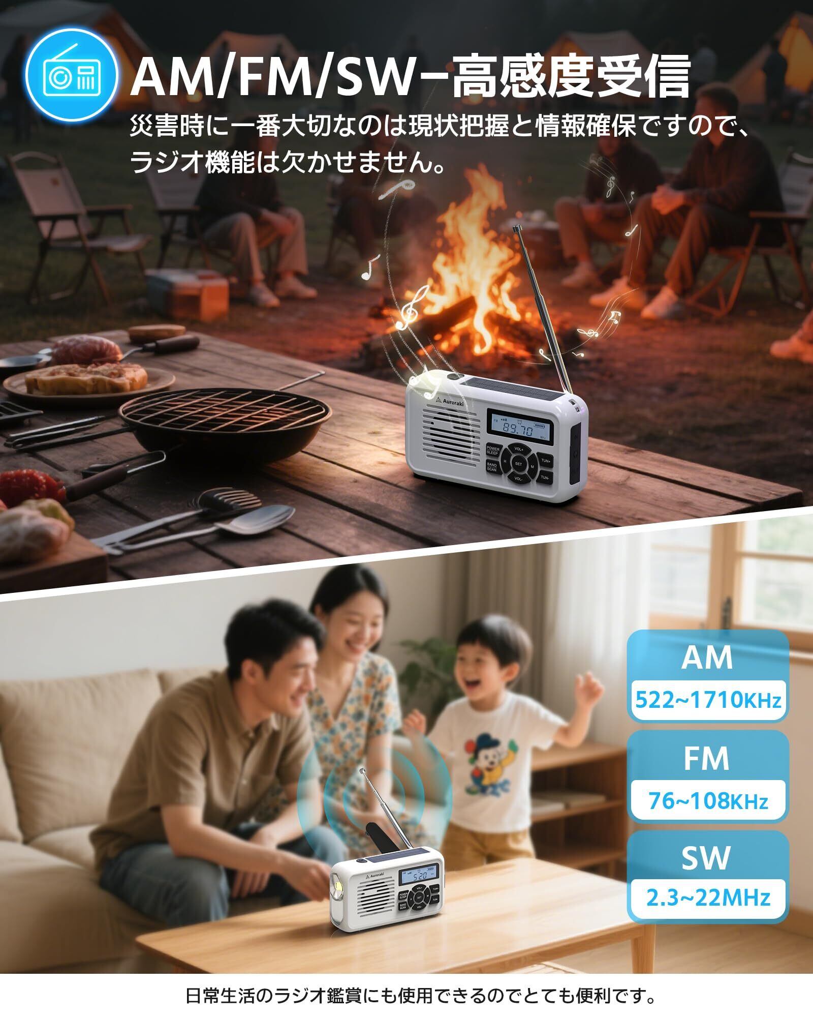 この「防災ラジオ」は、**AM/FM/SWラジオにSOSアラート機能を搭載し、災害時や緊急状況に必要な情報を迅速に提供します!** 手回し、ソーラー、USB充電の3つの方法で充電が可能で、2000mAhの大容量バッテリーを搭載しているため、いつでもどこでも安心して使用できます。