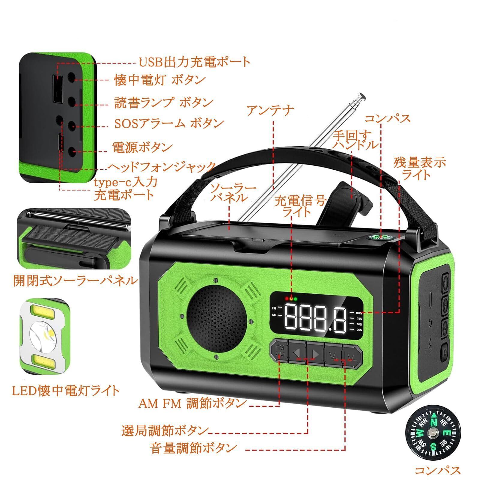 特徴 多機能防災ラジオ 12000mAh内蔵バッテリー 手回し充電 ソーラー充電 USB充電 懐中電灯 読書ランプ コンパス SOSアラート付き イヤホンジャック付き 自動選局&手動選局