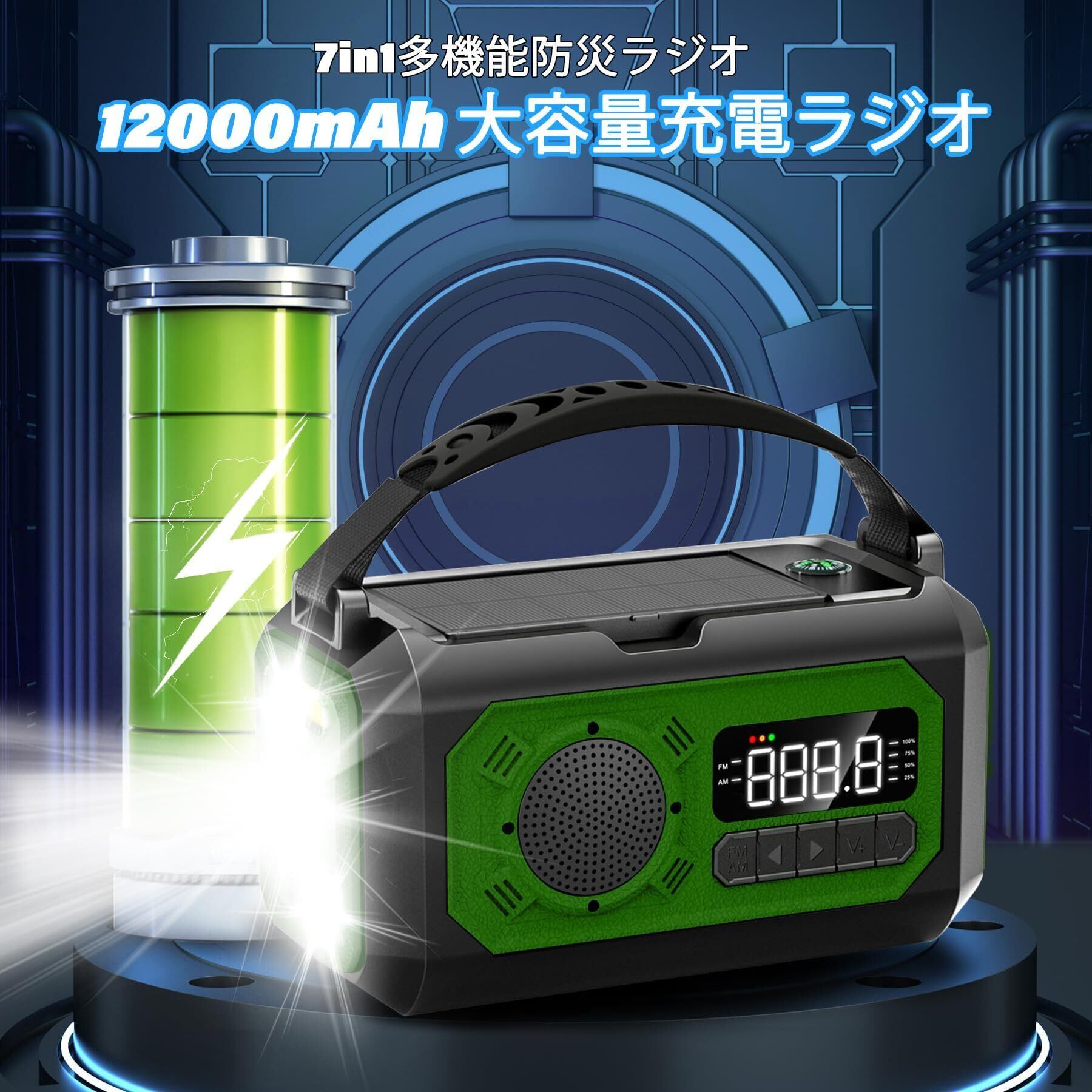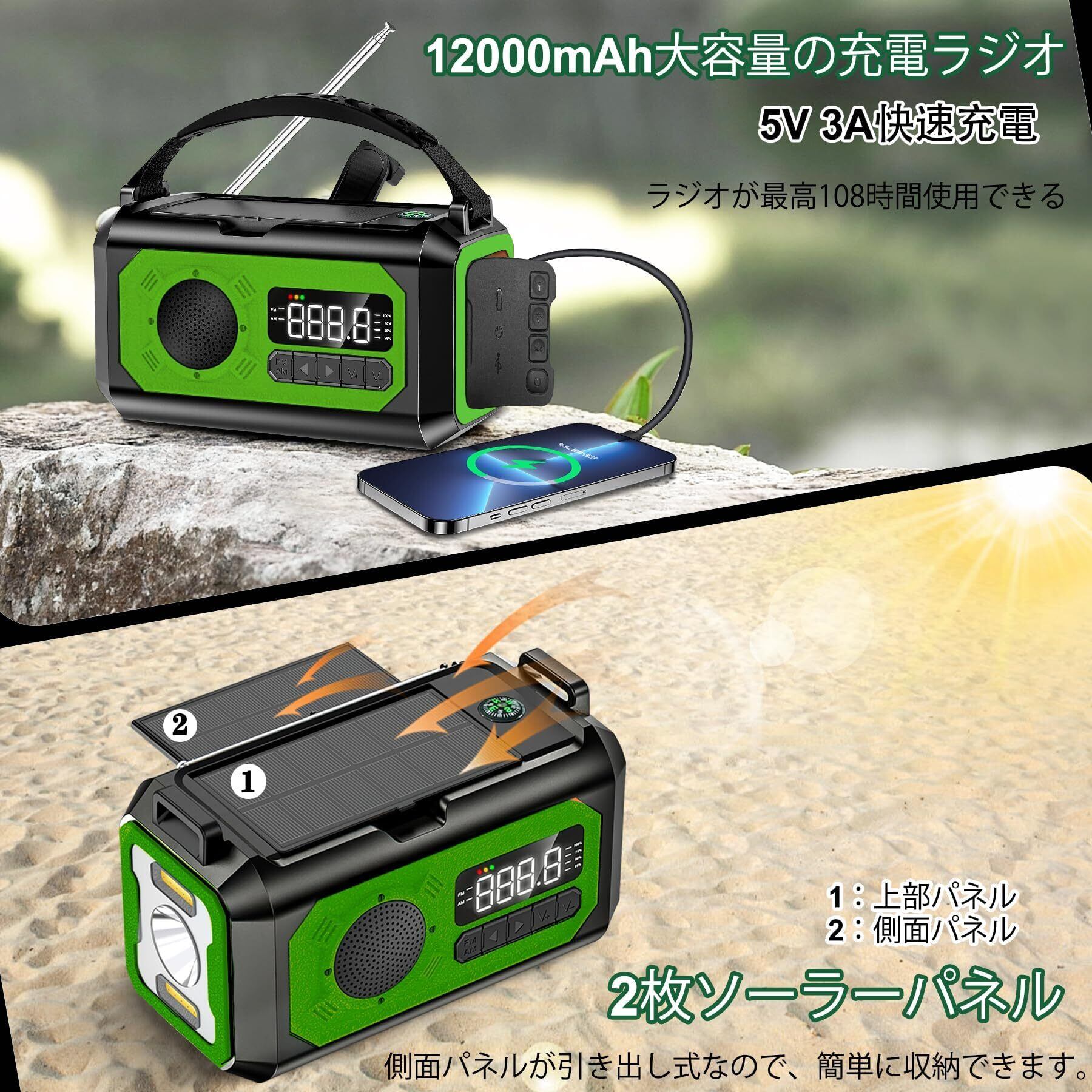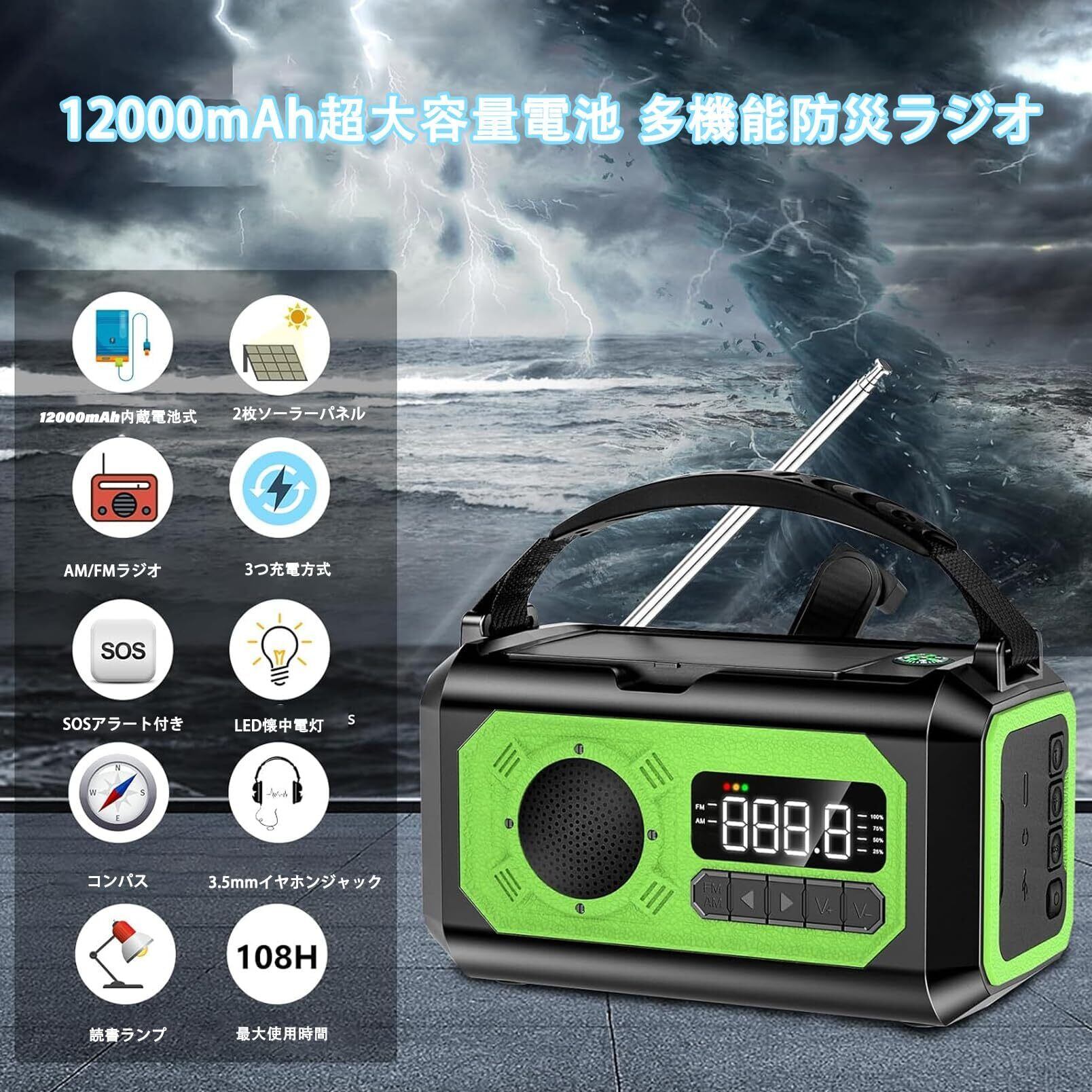【12000mAh電池内蔵】防災ラジオ ソーラー多機能ラジオ 手回しラジオ ラジオライト 充電ラジオライト 懐中電灯 読書ランプ付 SOSアラート付き 充電式 5V 3Aスマホに快速充電可能 防災ライト AM/FM携帯ラジオ 自動選局&手動選局 コンパス USB充電 停電対策 防災グッズ イヤホンジャック付き 照明器具 携帯充電器 地震 台風 火事 震災 津波 などの緊急に対応 (グリーン)