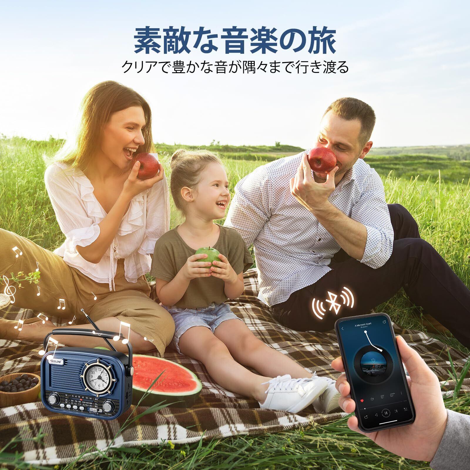 **Bluetooth機能を利用して、お手持ちのスマートフォンやタブレットから音楽をワイヤレスで再生できます!** ラジオを聴くのはもちろん、お気に入りのミュージックプレイリストも楽しめて、より多彩なシーンで活躍します。