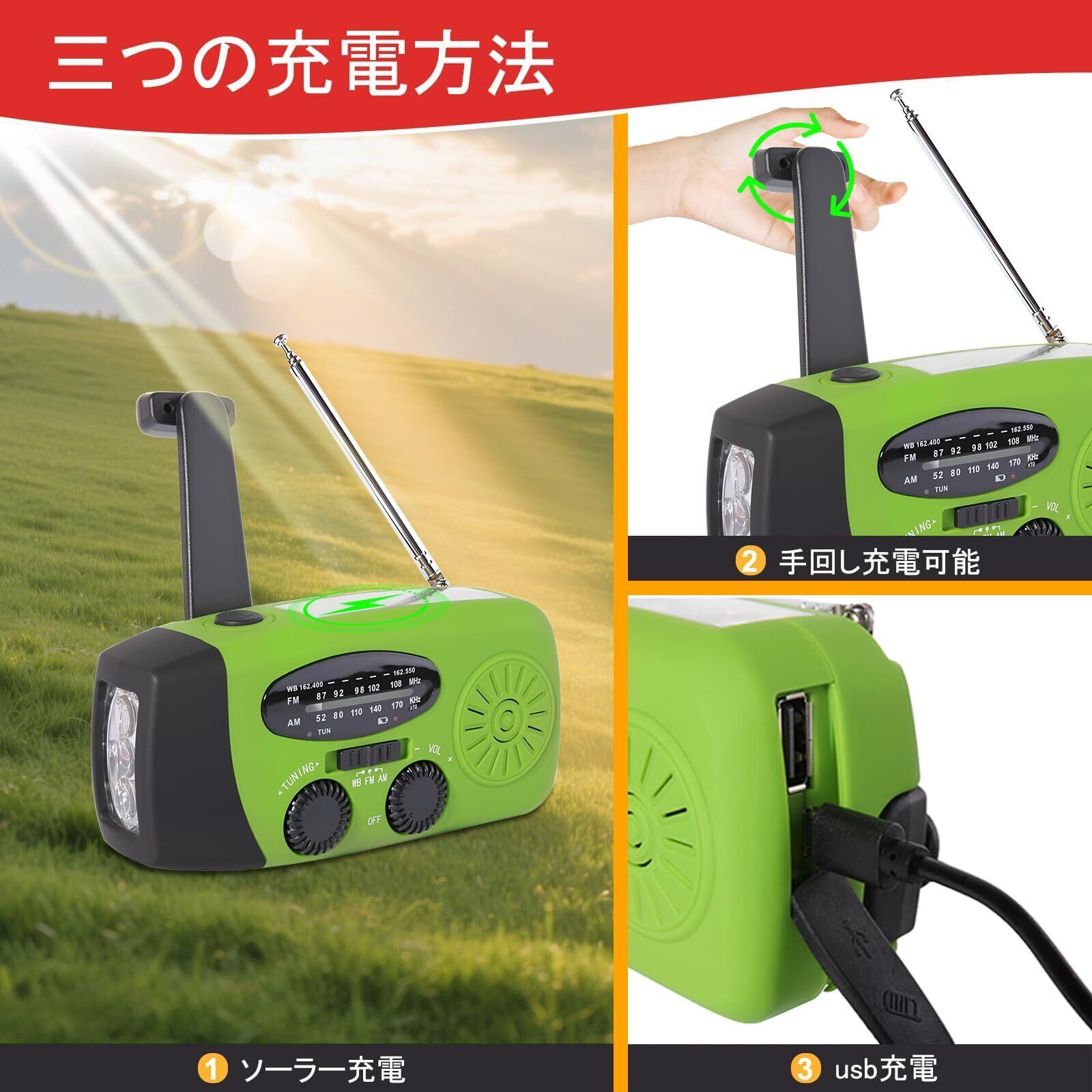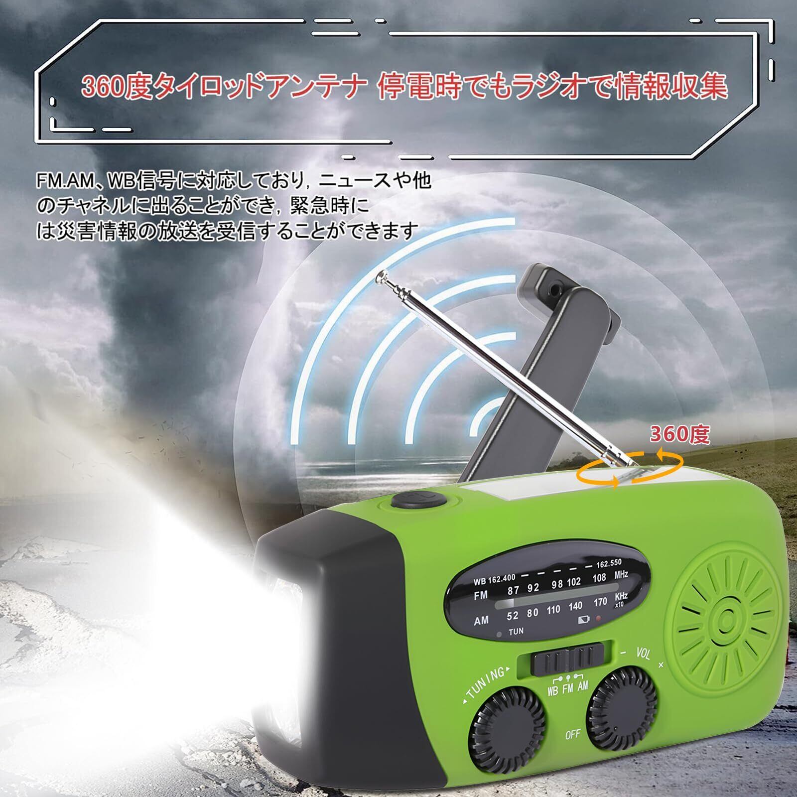 AM、FM、WB信号の受信ができるので、災害時に最新のニュースが聞けます。 携帯電話や電化製品の充電用電源としても使えます。
