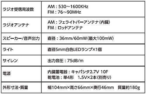 ●使用時間(乾電池):ラジオ=40時間、ライト=19時間、サイレン=17時間、携帯電話(連続通話)=20分、携帯電話(連続待受け)=30時間、スマートフォン(連続通話)=20分、スマートフォン(連続待受け)=4時間