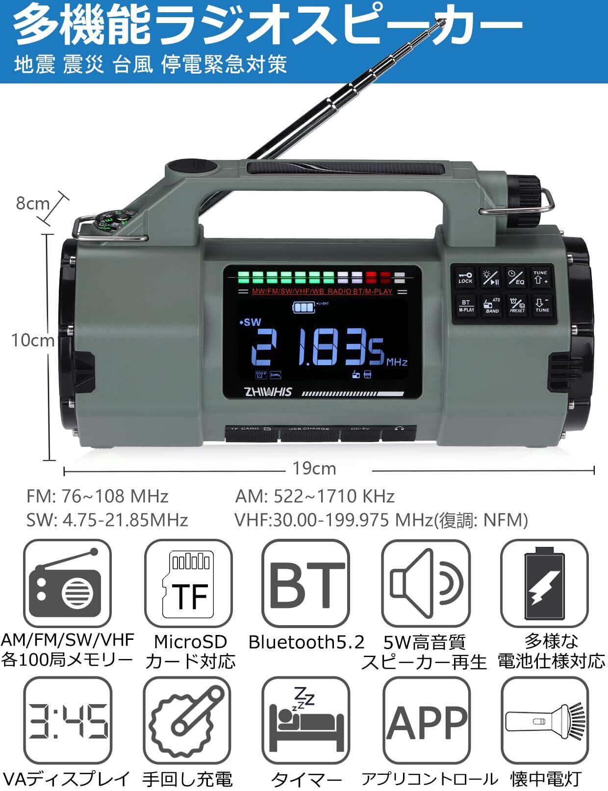 ZHIWHIS 防災ラジオ Bluetoothスピーカー/マイクロSD再生 APPコントロール/懐中電灯 VHF/FM/AM/短波/ワイドFM対応 ソーラー/手回し/USB-C充電/乾電池で使用可能 タイマー/アラーム 震災 台風緊急対策 2025新登場ZWS-908