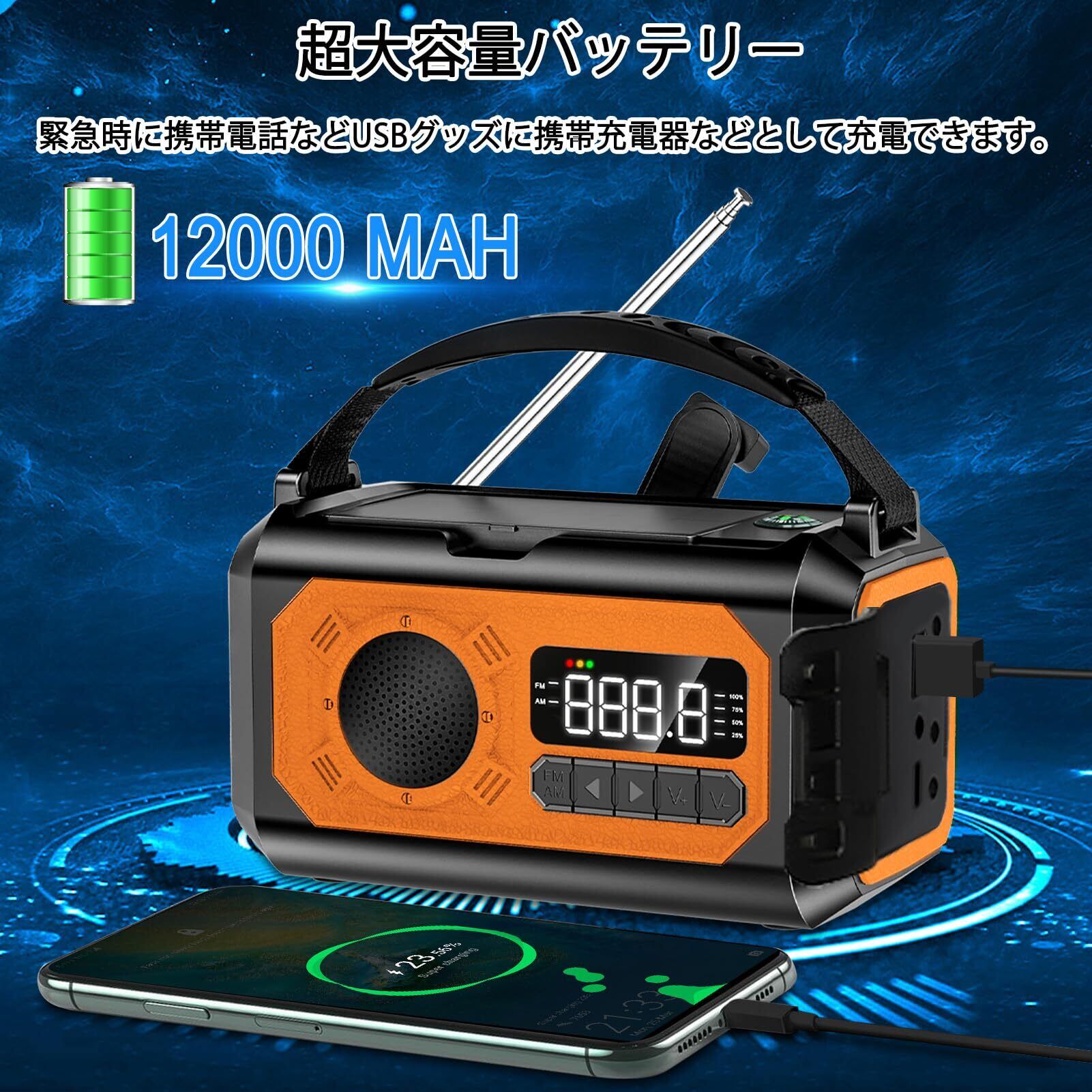 この「12000mAh防災ラジオ」は、**大容量の12000mAhバッテリーを搭載したソーラー多機能ラジオです!** 手回し、ソーラー、USB充電に対応し、停電時や災害時でも安心してご利用いただけます。