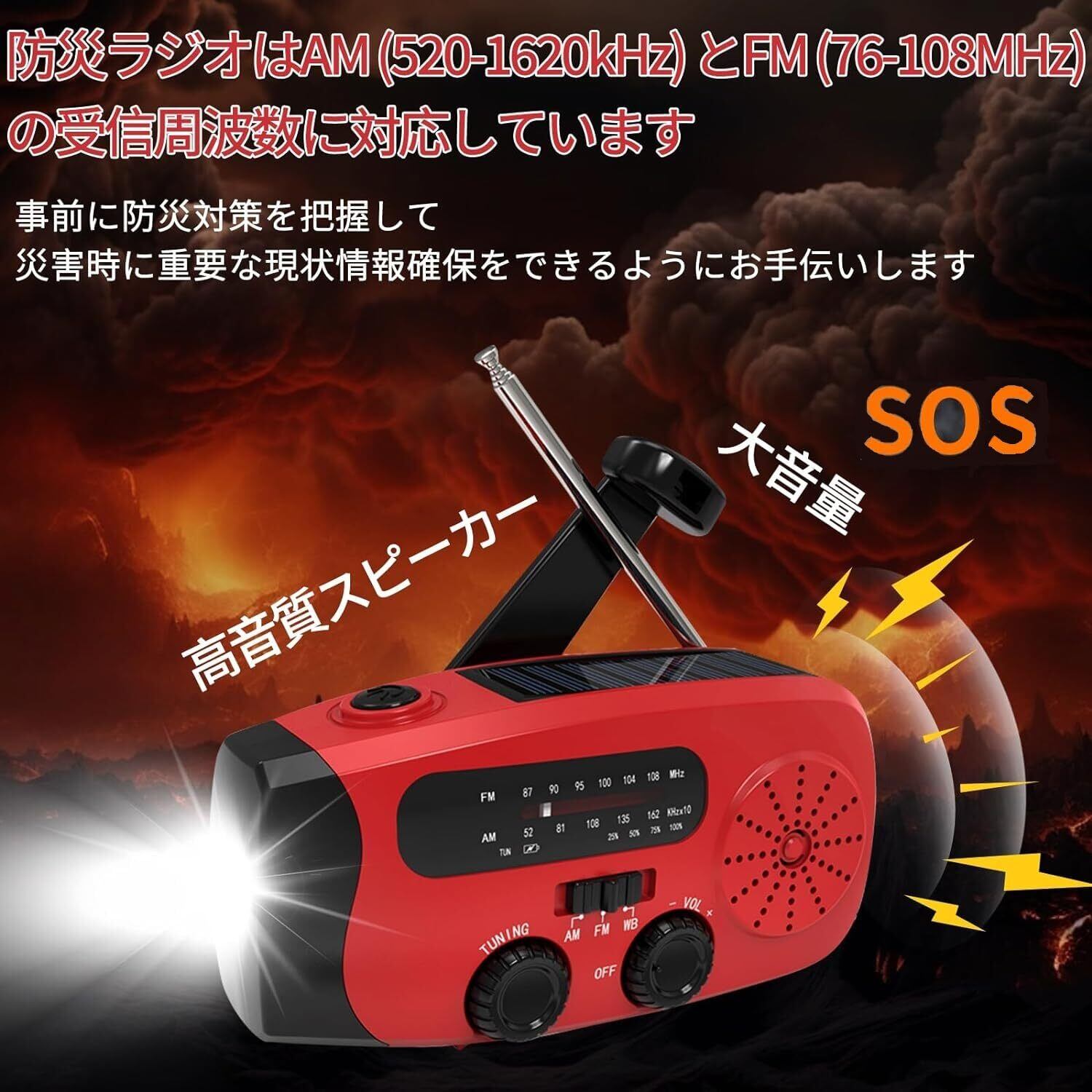 **AM(522-1710kHz)とFM(76-108MHz)に対応しており、緊急時に必要な最新情報をしっかりキャッチできます!** 地震、津波、台風などの自然災害に備えた強力な情報源です。