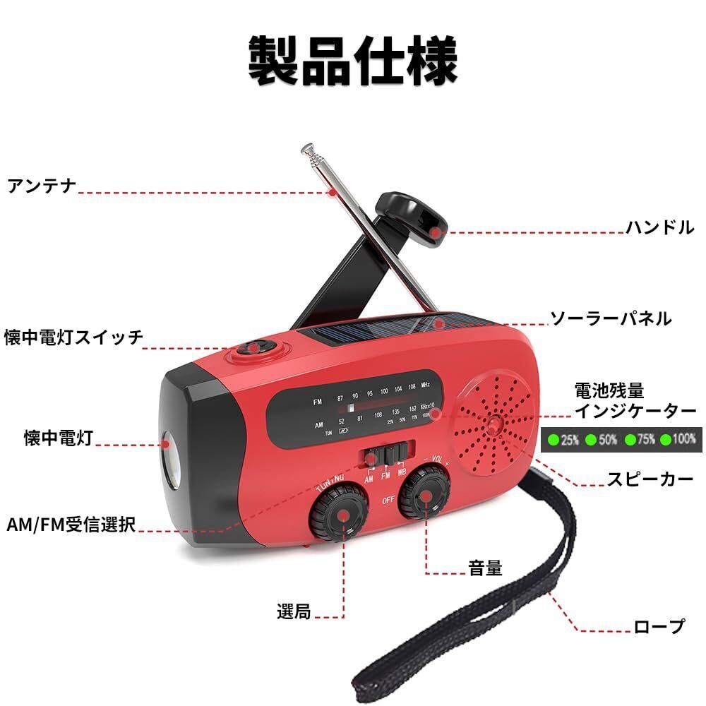 【電池残量インジケーター】バッテリー残量を4段階で表示します。バッテリー残量が一目で分かるインジケーター、電池残量を細かく把握できます。●【高輝度懐中電灯】高輝度のLEDライトを内蔵された充電式ライト、キャンプ、ハイキング、またはその他の野外活動での夜間の視認性を大幅に向上させます。●【IPX3防水】このラジオは生活防水を満たしています。(完全に水に浸さないでください)