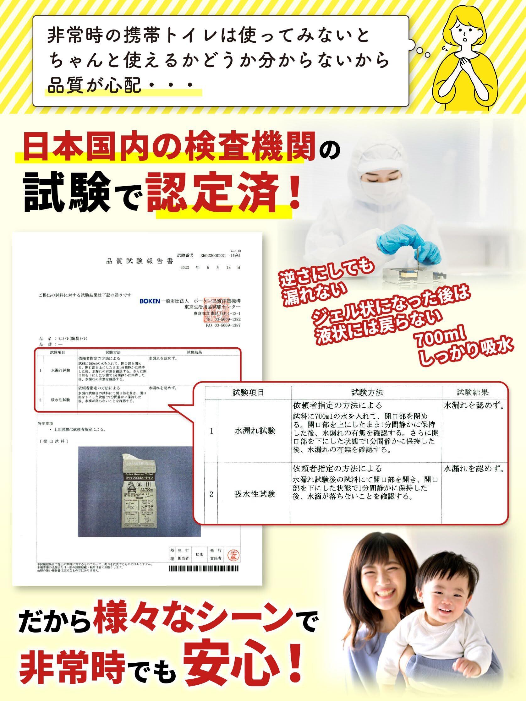 ・【第三者検査機関検査済で安心の高品質】日本国内の第三者検査機関で「700ml吸水試験」、「水漏れ試験」、「ジェル状に固まった後に液状に戻らないか」といった試験を実施して認証済みです。 防災グッズ としての 簡易トイレ は使ってみないと品質が分からないというお客様のお声に寄り添って品質試験によって実証済ですので、より安心してご使用いただけます。