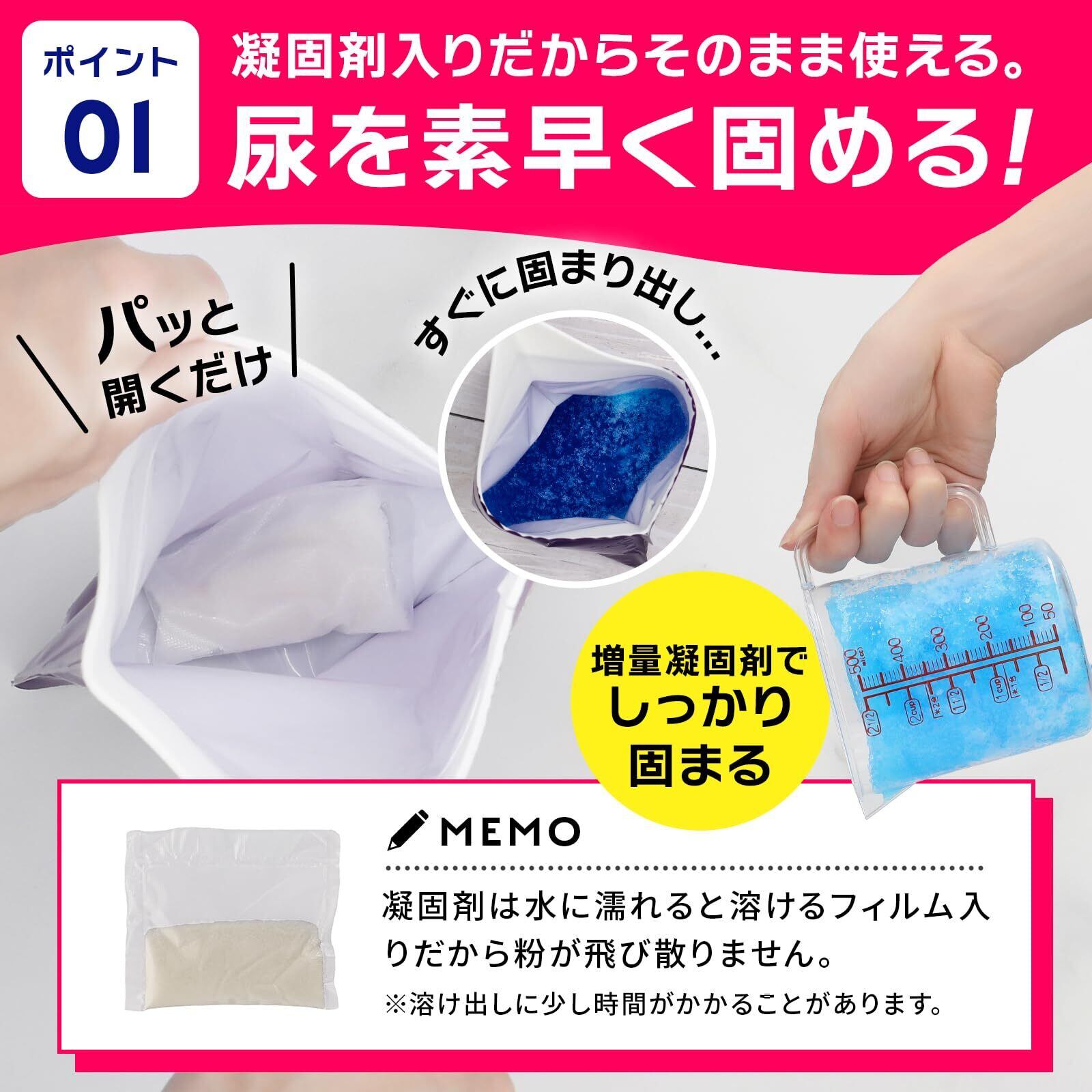 【消臭凝固剤】おしっこで凝固剤が飛び散らないように水に溶けるフィルム入り。凝固剤増量でしっかり固まる。ファスナー付きで臭いをシャットアウト。使用後は中身の見えない黒色持ち帰り袋に入れるだけ。【凝固剤増量でしっかり固まる】大容量1000㏄(最大許容量)の水分をしっかり固めるので使用後の廃棄がしやすいです。