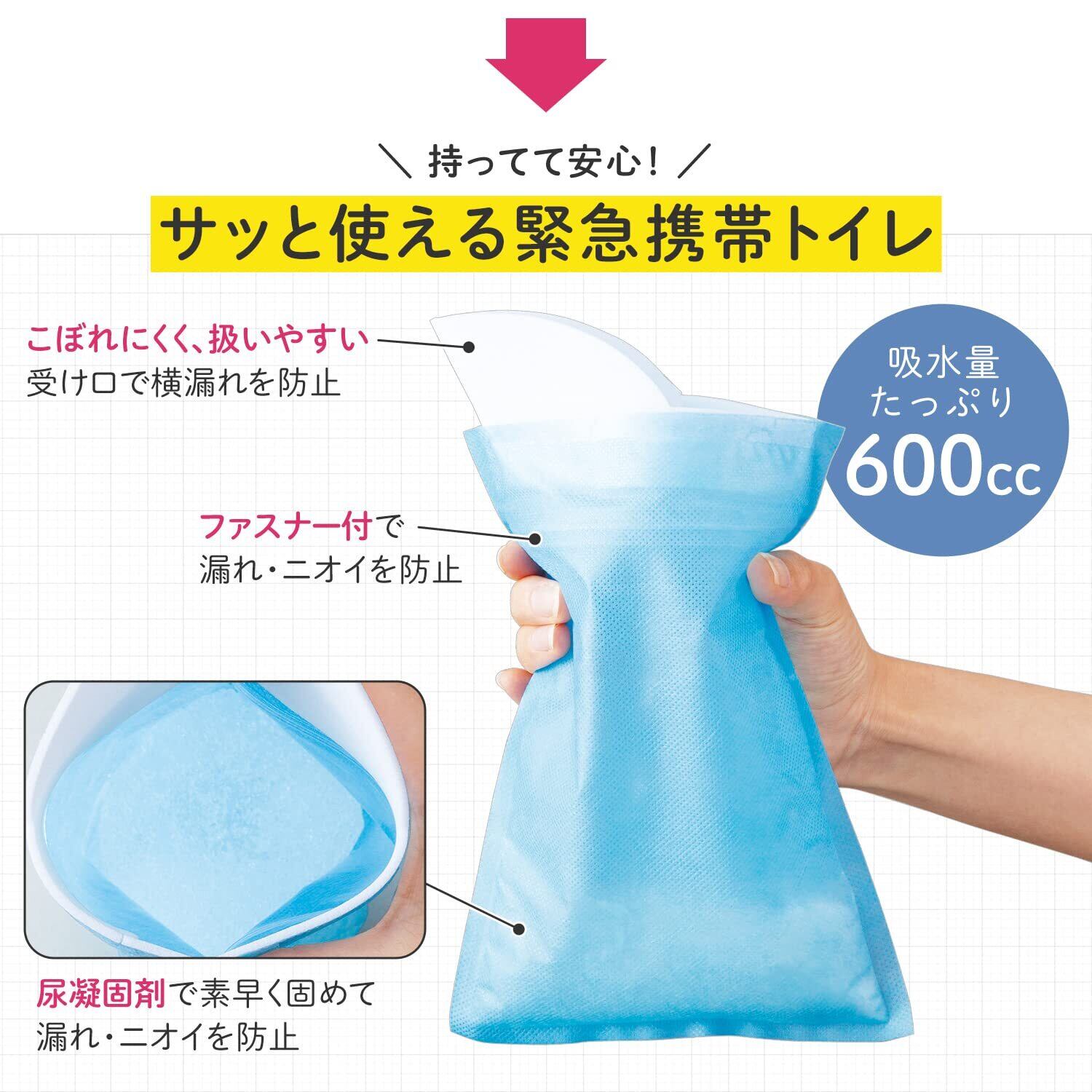 **600ccの容量を誇り、男女兼用で安心してご利用いただけるデザインとなっています!** 簡単に持ち運べるため、緊急時の必需品として最適です。