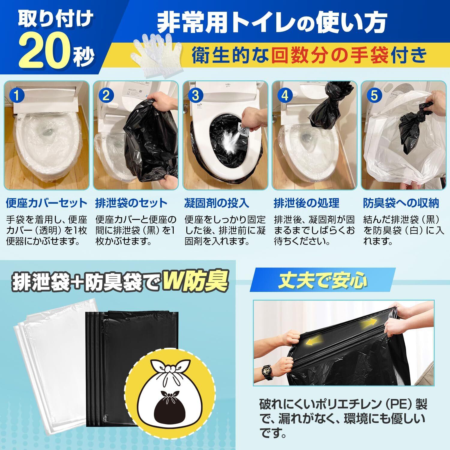 【取付はたったの20秒】【衛生的な手袋付き】トイレに被せるだけの簡単取付なので、ストレスなく簡単にお使いいただけます。使用後の衛生管理も簡単です。災害用トイレとしてだけでなく、携帯トイレとしてトイレにすぐにいけない場合にも活躍します。停電/介護/渋滞/嘔吐/外出の際にもお使い頂ける簡易トイレです。