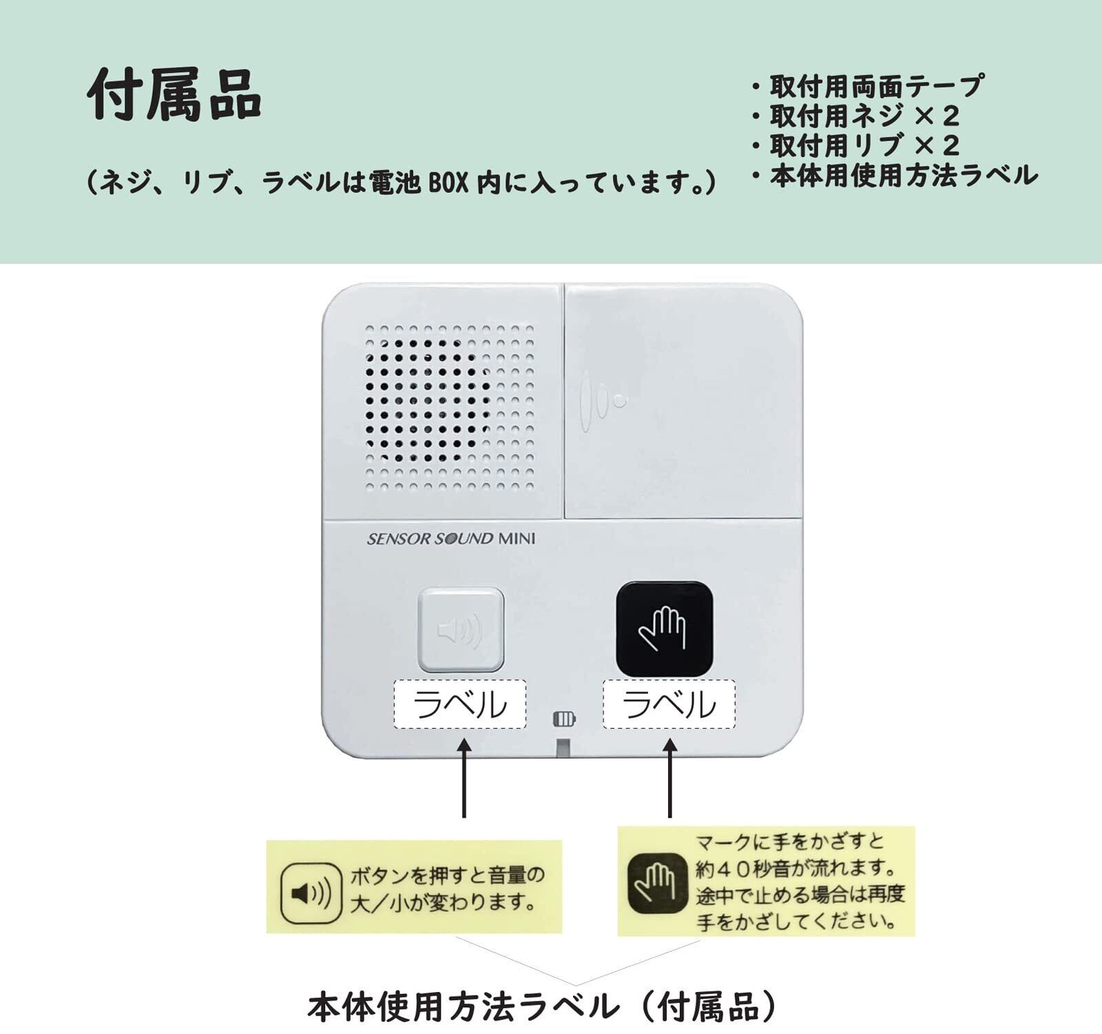 センサー:非接触センサー、動作:センサーから約5cmのところで手をかざすと約40秒間流水音が流れる・再度手をかざすと止まる、音量:約80dB (1m最大)/約70dB(1m最小)切替式、使用温度範囲:-10~45度