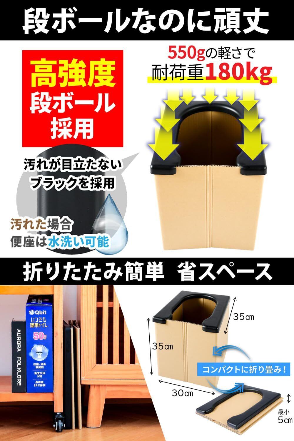 この「Qbit 非常用トイレ」は、**耐荷重180KGを誇り、どなたでも安心してご使用いただける設計です!** 段ボール素材で作られているため、軽量でコンパクト。持ち運びにも便利なので、旅行やキャンプにも最適です。